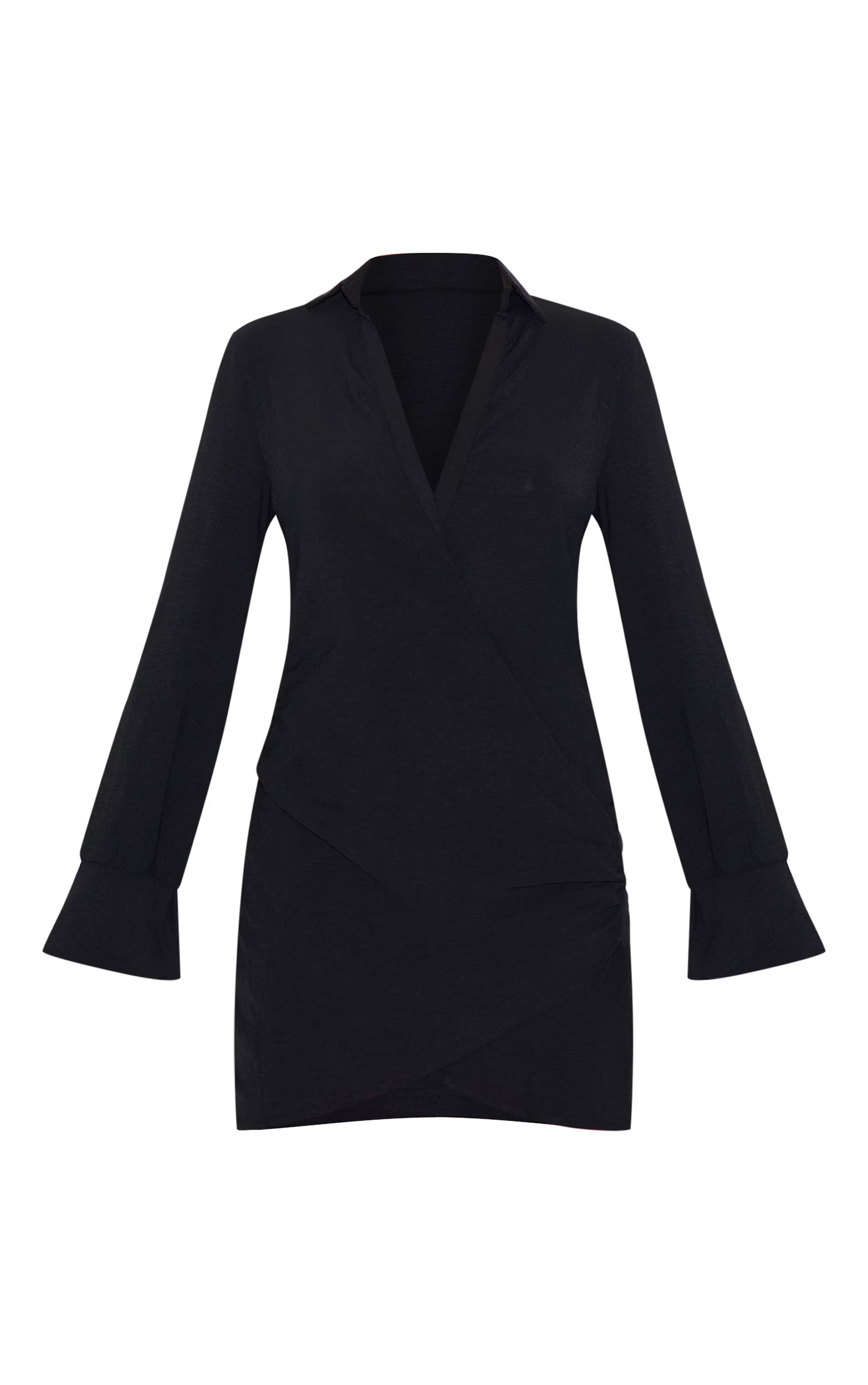 This long sleeve shirt dress is sure to give your weekend wardrobe a serious update. Featuring a black textured woven material with an extreme plunging neckline, bell cuff sleeves and a shirt silhouette. A wrap shirt dress gives your silhouette the best of both worlds. This style is super versatile and perfect for dressing up or down whatever the occasion. Team this with heeled mules and simple accessories to complete the look.