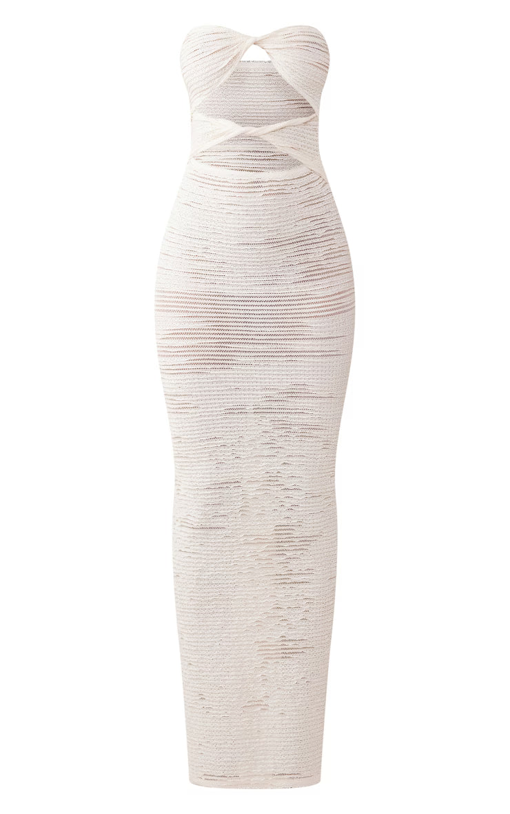 Elevate your after-dark edit with this cream textured maxi dress. The bandeau neckline offers a clean, contemporary silhouette, while the subtle twist detail draws the eye and accentuates the form. Crafted from a textured fabrication, the cut-out design lends a knowing nod to modern sensuality. Style this piece with delicate gold jewelry for an assured evening statement.