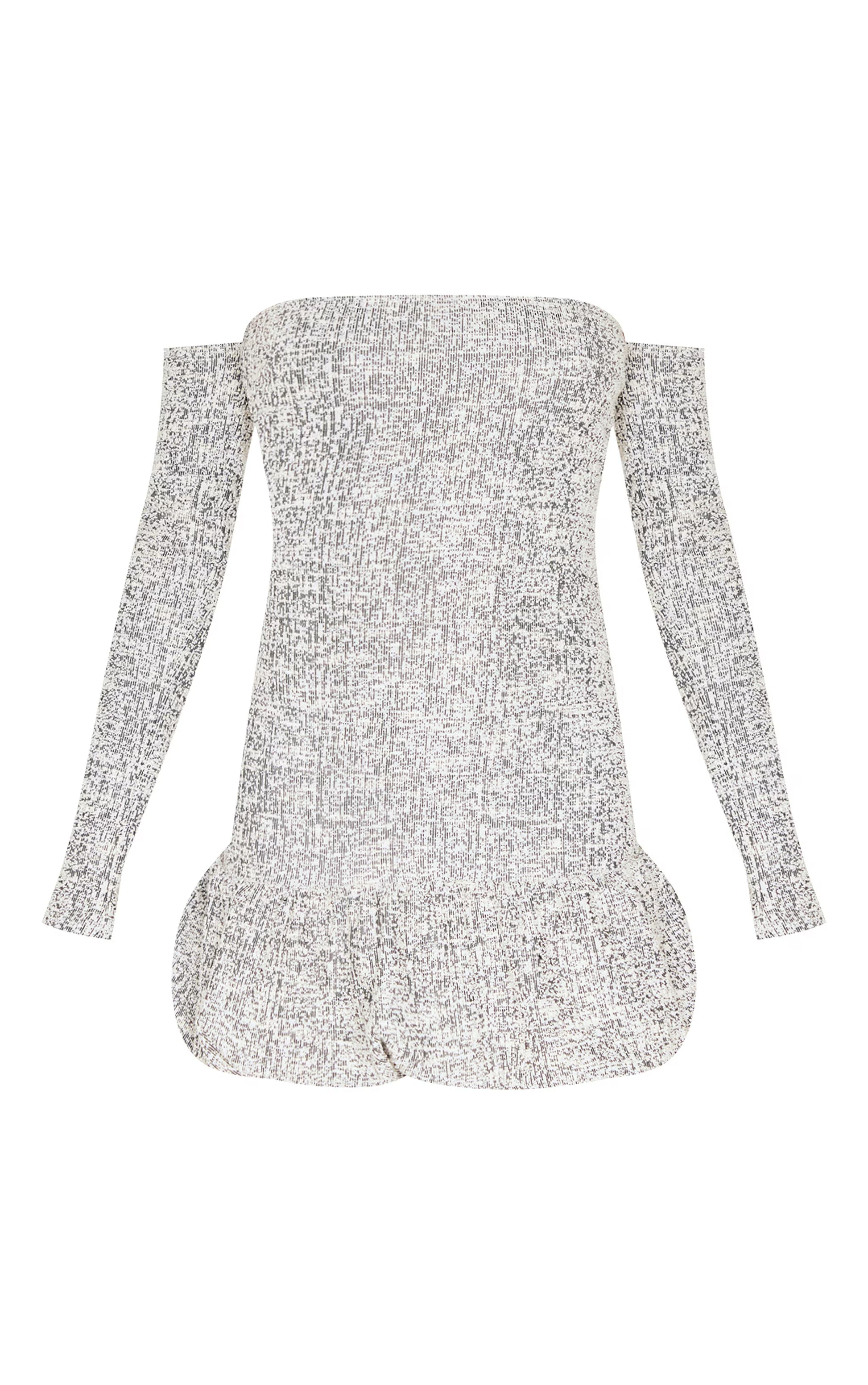 Refine your after-dark aesthetic with this monochrome bouclé mini. The off-shoulder Bardot neckline provides a modern counterpoint to the vintage-inspired texture of the bouclé. Its monochrome palette ensures seamless integration into your existing wardrobe, while the puffball hem adds a touch of considered volume. Elevate the look with a delicate chain necklace from our jewelry collection, allowing the dress to command attention.