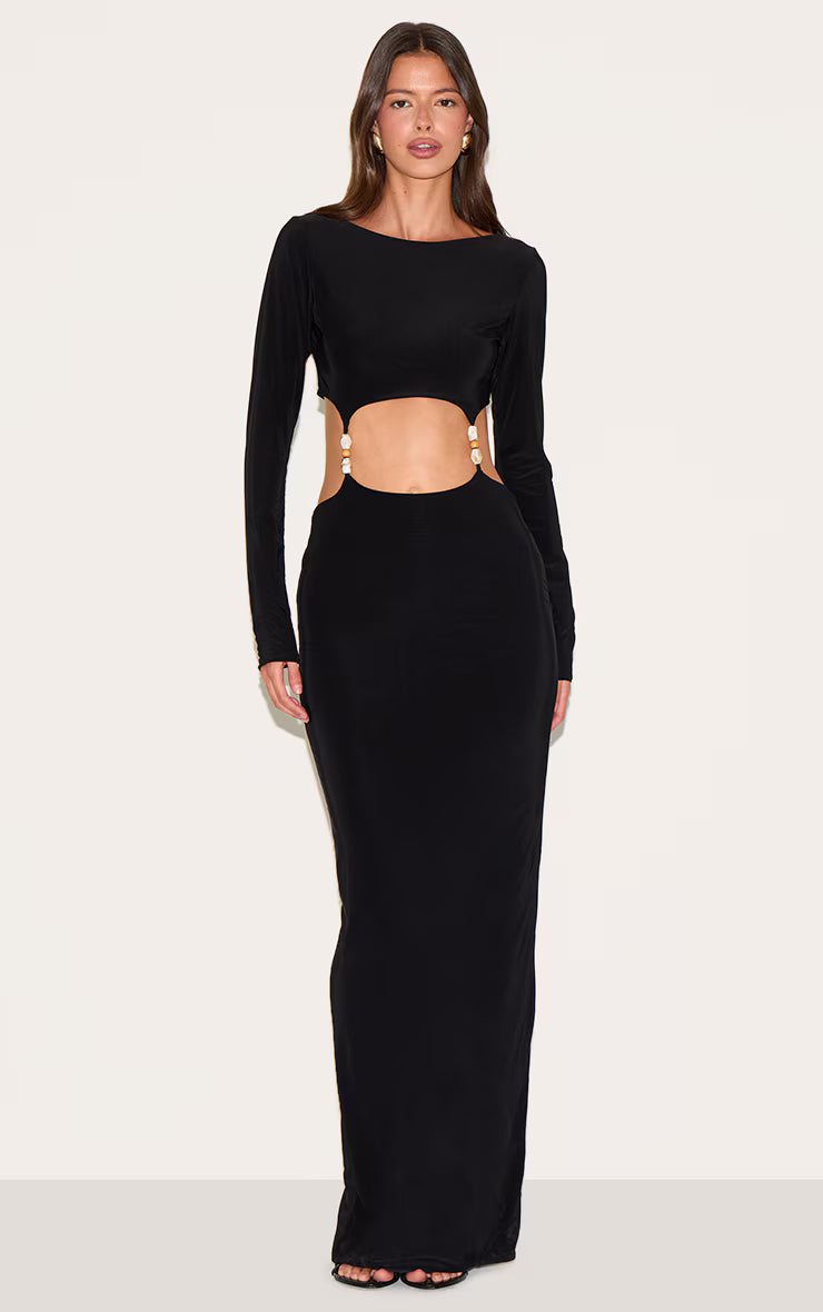 Black Double Slinky Trim Detail Cut Out Maxi Dress