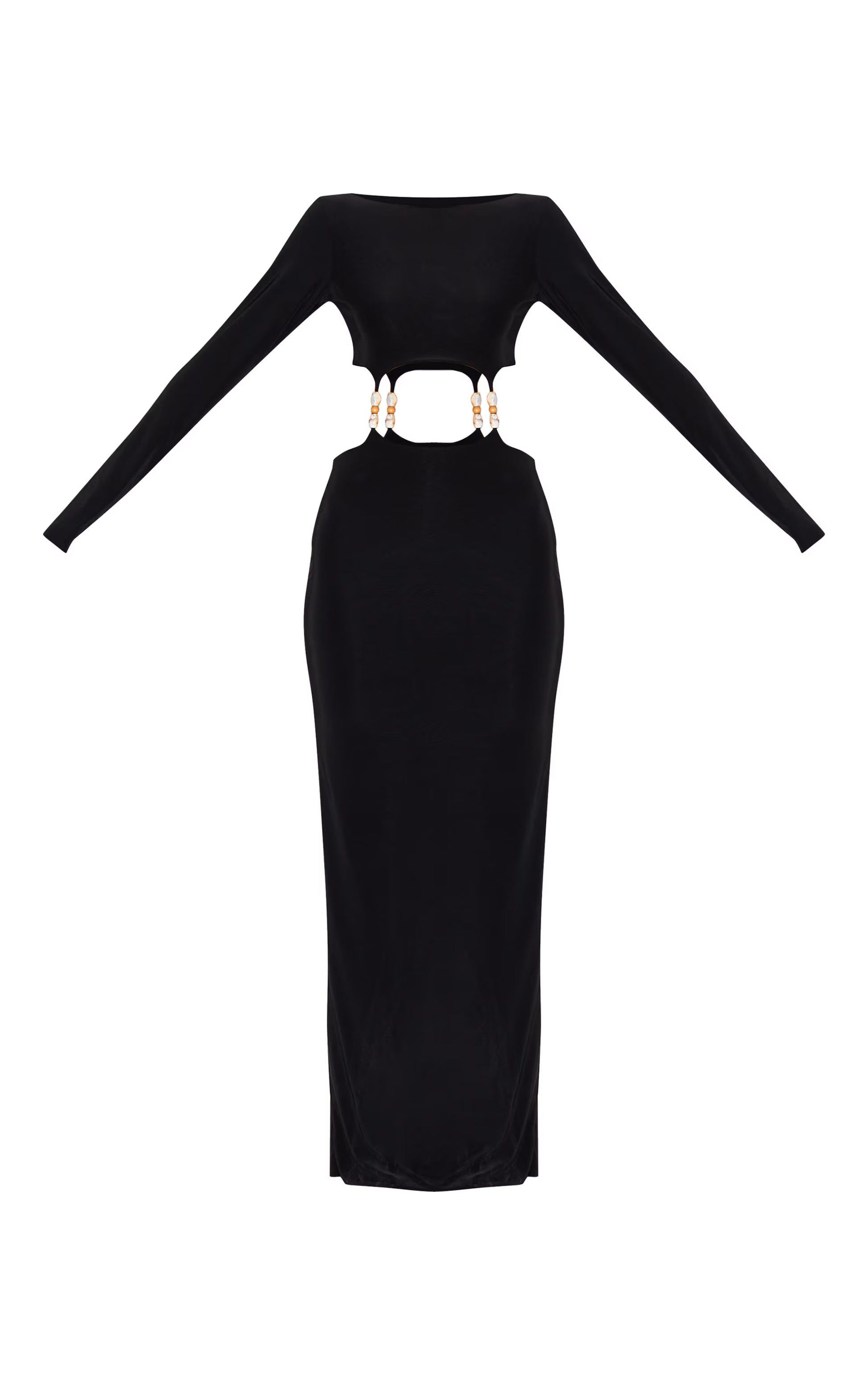 Master evening's agenda in a silhouette that understands impact. The black double slinky trim detail cut out maxi dress features a refined boat neckline leading to confident cut outs at the waist, accented by a double slinky trim detail defining the shape. This black dress falls with a sharp line to a maxi length. Pair with statement earrings and stiletto heeled sandals to command attention after dark.