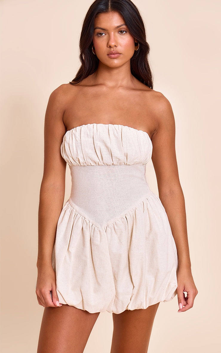 Introducing this stone ruched bust shift dress. Tailored from stone hue material, this dress has a ruched bust design with a fashion-forward puffball skirt. Level up the look by teaming this with strappy heels and oversized gold jewelry.