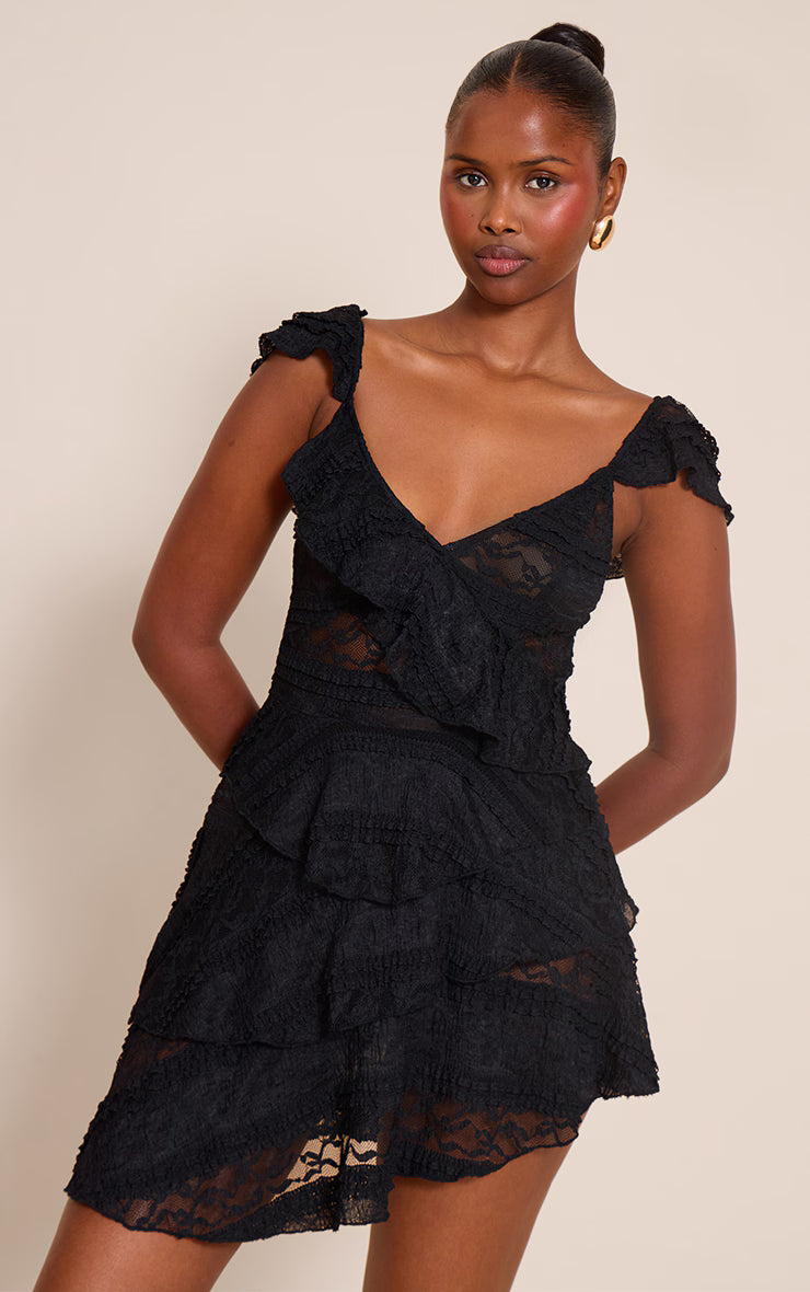 Black Lace Frill Detail One Mini Shift Dress