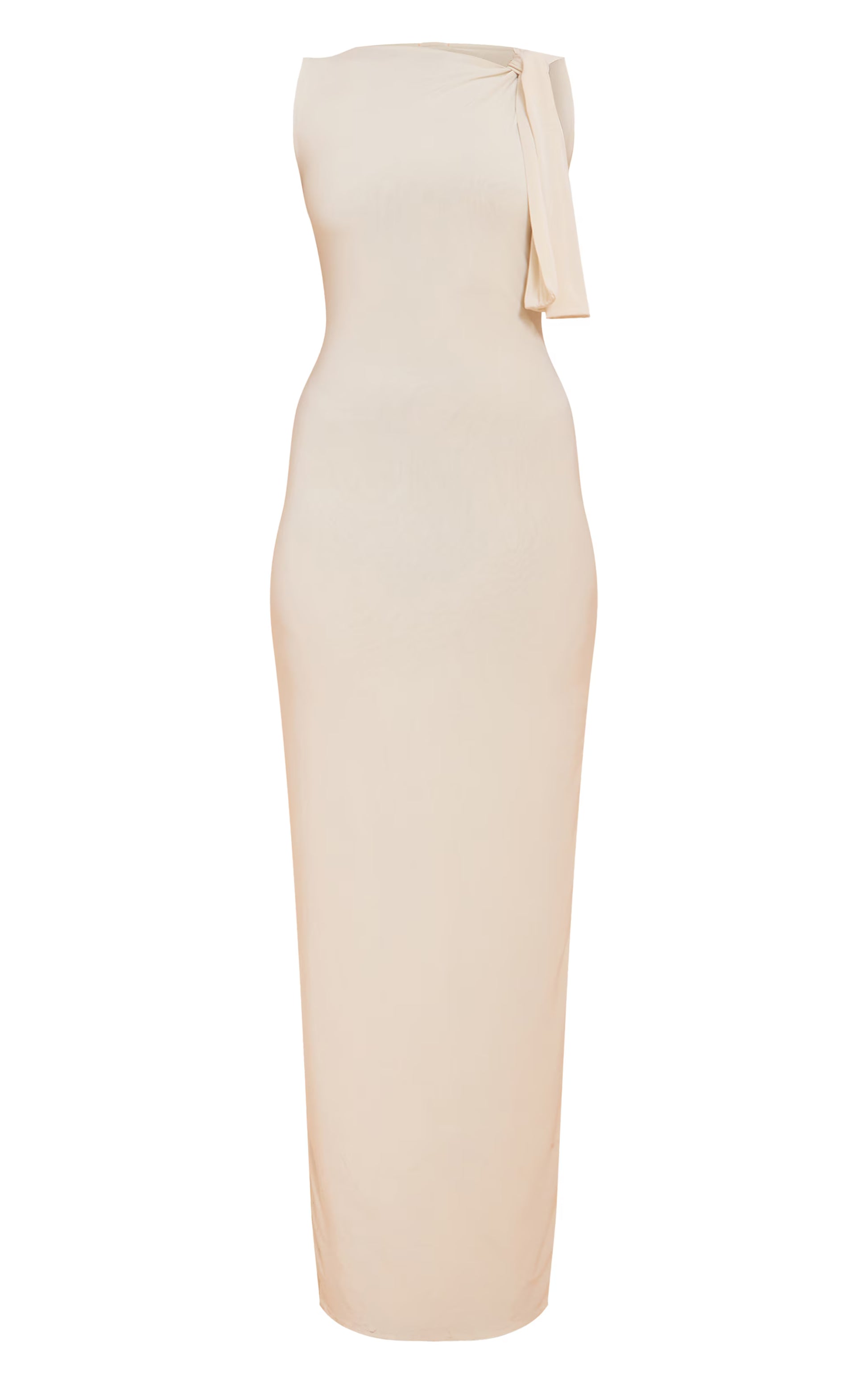 Stepping out is an art form. The butter cream slinky knot drape midaxi dress offers a sophisticated profile shaped with a contemporary one shoulder neckline that cinches into an artful knot and flowing drape detail. This midaxi length piece contours the body for a confident silhouette, perfect for evening occasions. Finish the look with barely-there heeled sandals and minimal gold jewelry for an understated impact that speaks volumes.