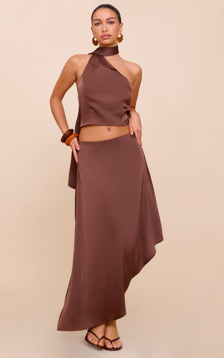Step into elegance with the dark brown satin asymmetric midi skirt. Made from glossy satin with a fluid drape and off-kilter hemline, it brings a touch of drama to your look. Style it with the matching top and heels for evening chic.