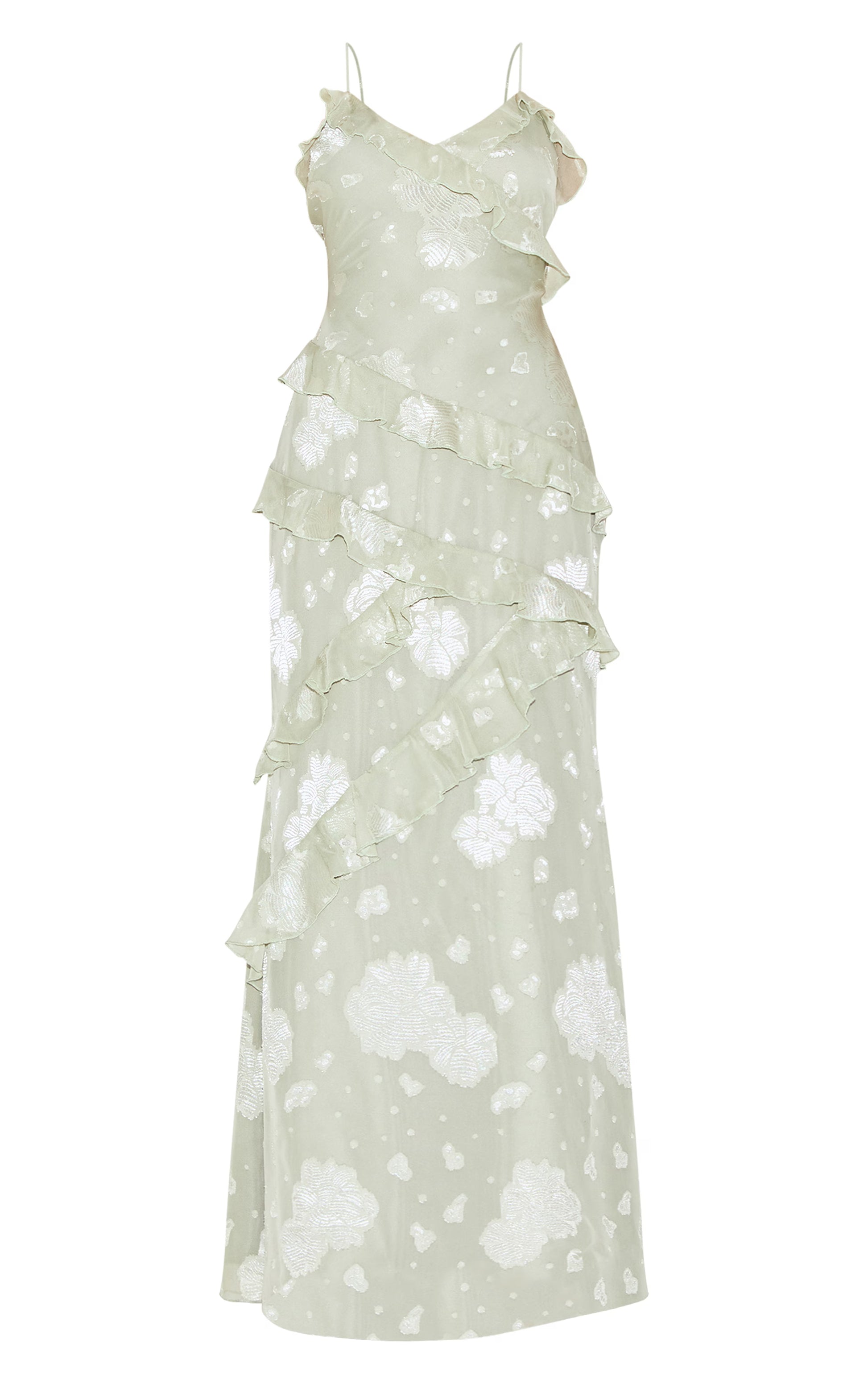 Brought to you in sage green hue material with delicate floral embroidered detailing, frill accents, simplistic spaghetti straps and a classic maxi length fit. Elevate your occasion wear wardrobe with this sage green embroidered frill maxi dress, perfect for combining with statement gold stud fastening earrings and neutral barely there heels.