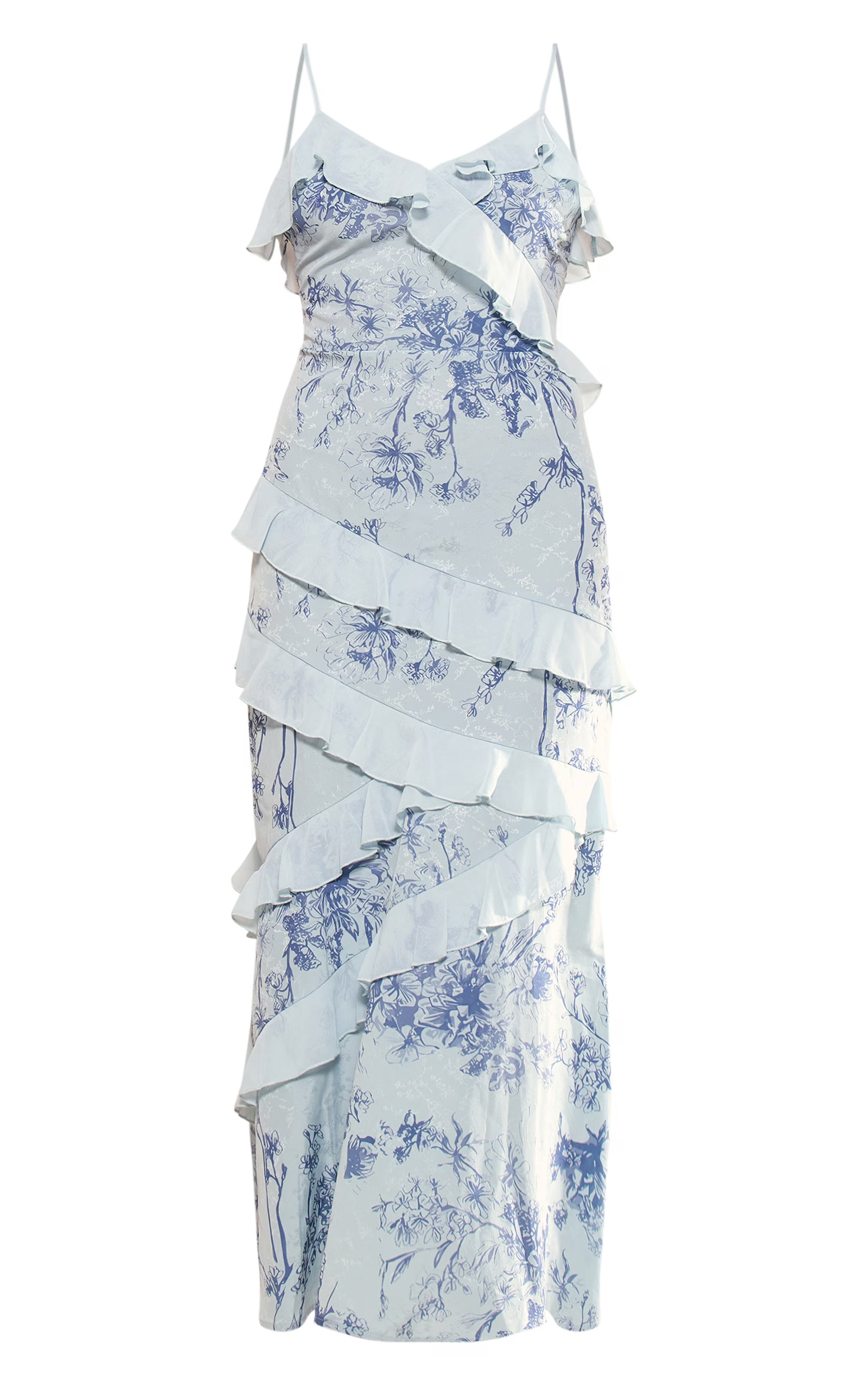This maxi dress offers a masterclass in warm-weather dressing. Crafted from lightweight light blue chiffon, its delicate floral print adds a touch of refined femininity. Note the considered frill detailing that elevates the silhouette, while the maxi length provides an elegant drape. Consider styling this piece with sculptural gold earrings for a considered occasion look.