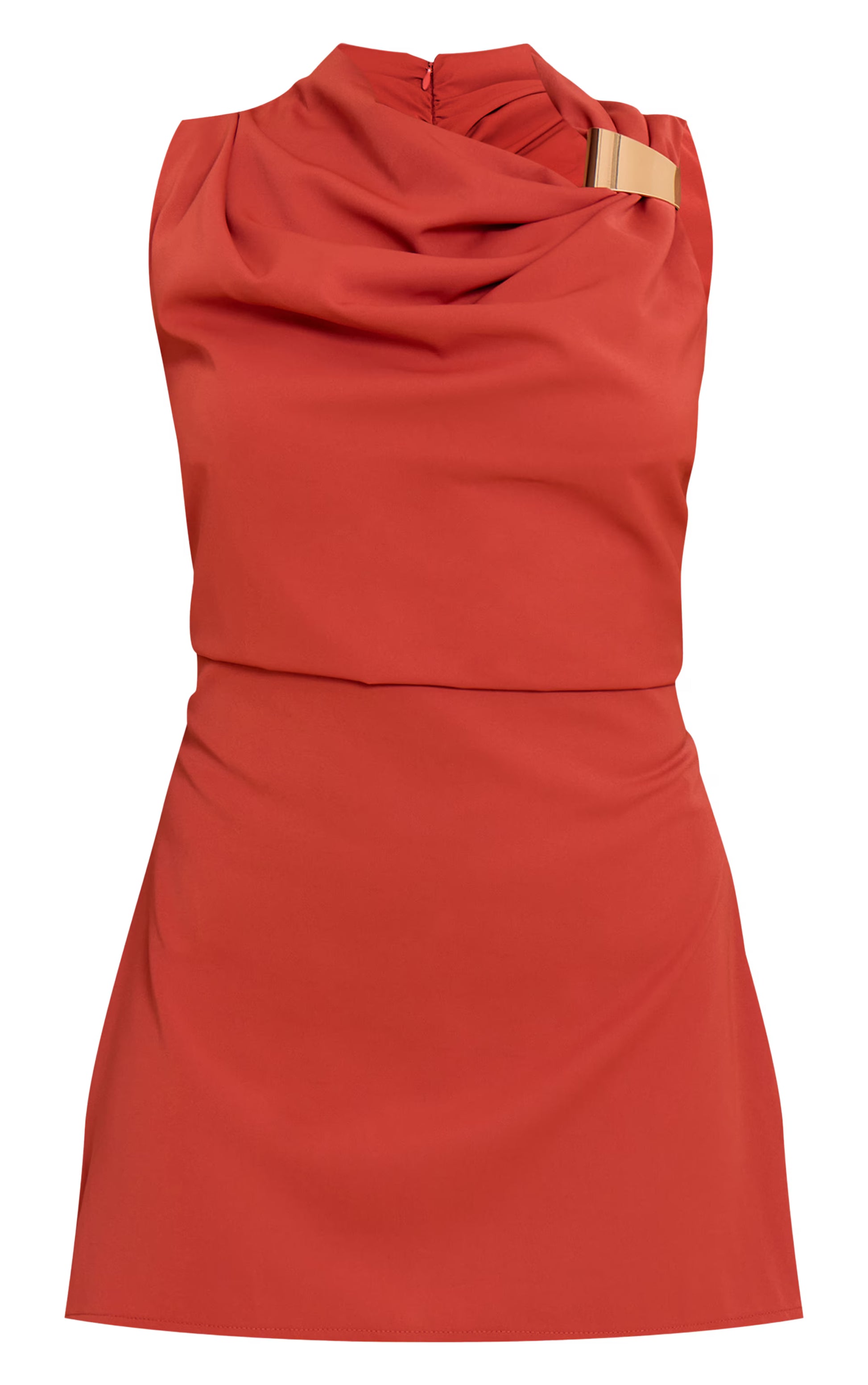 The burnt orange trim shift mini dress carves a knowing silhouette, featuring an artful cowl neckline highlighted by a unique trim detail on the shoulder strap. Its cut is sharp, with a fitted bodice flowing into a clean-lined mini skirt. Perfect for elevated evening plans, anchor this piece with sharp heeled sandals and minimal accessories.