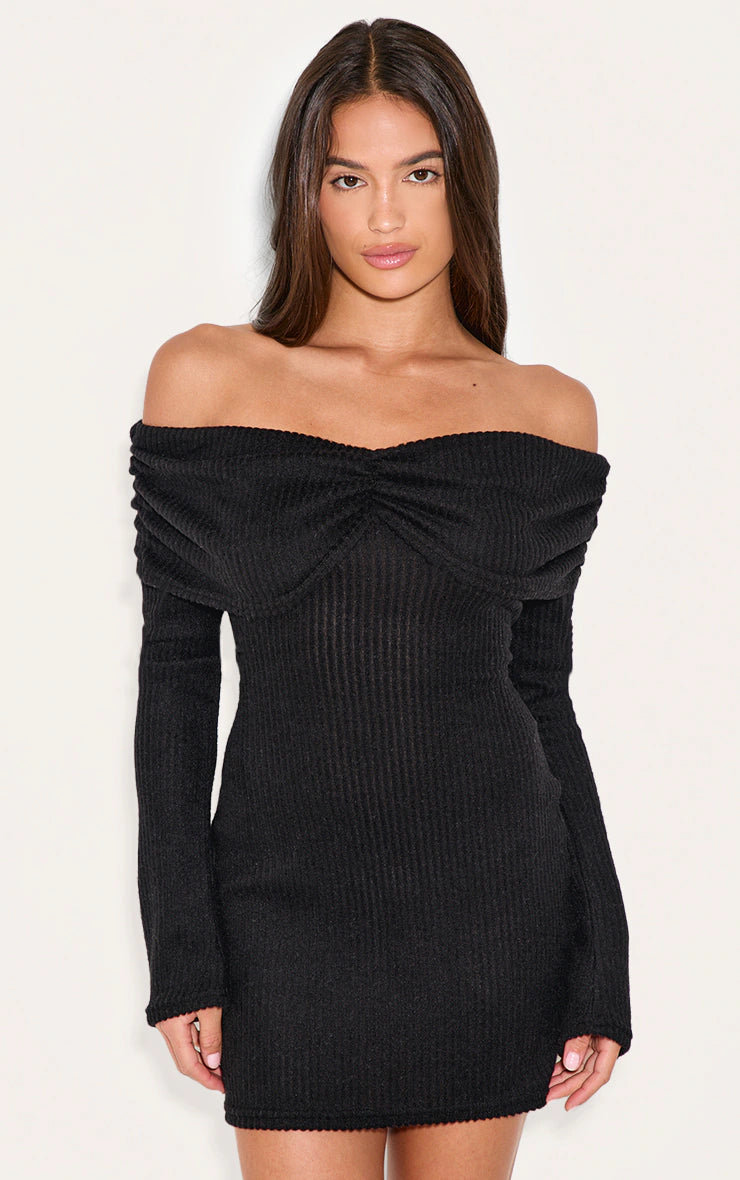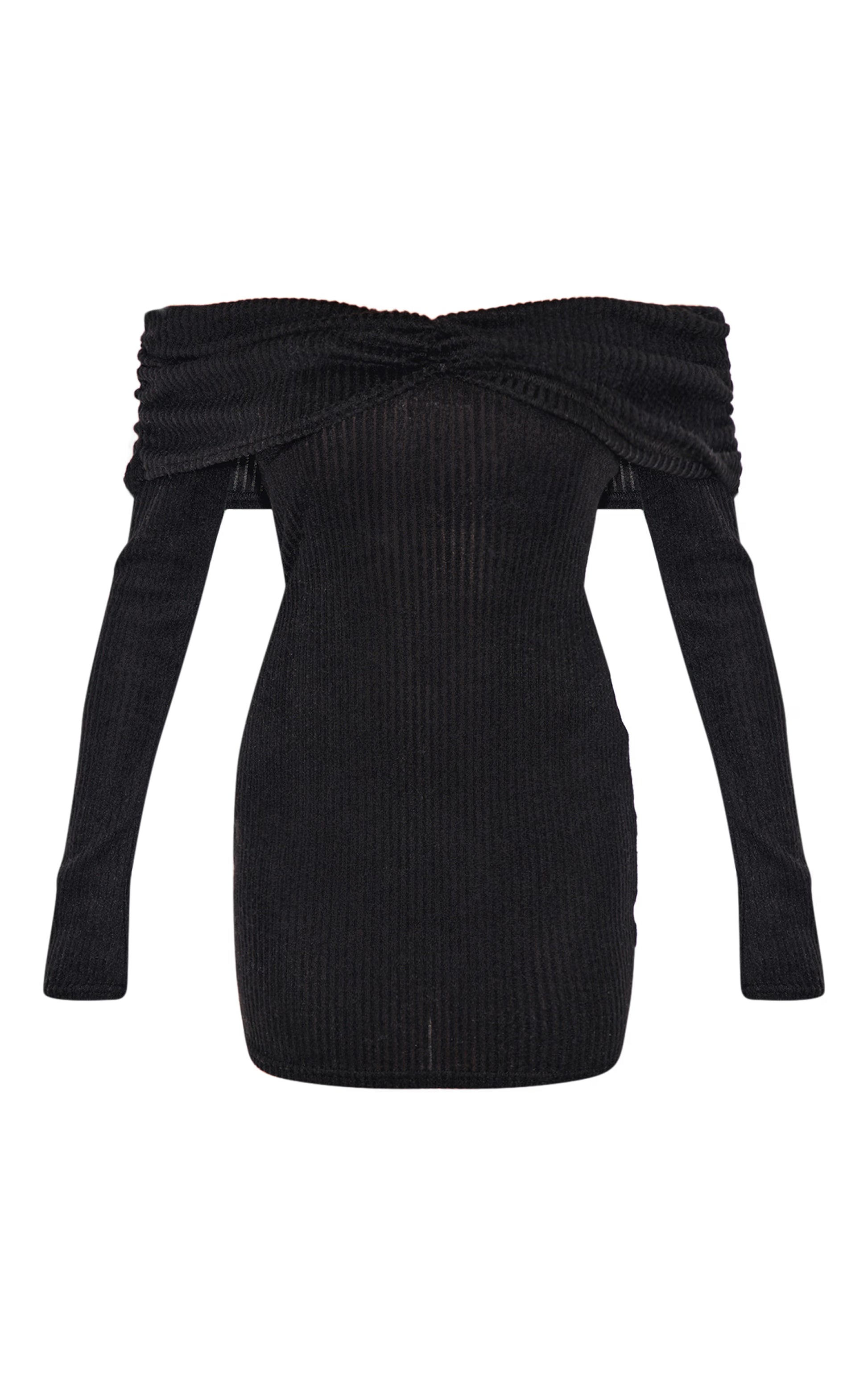 Black Brushed Rib Bardot Long Sleeve Bodycon Dress