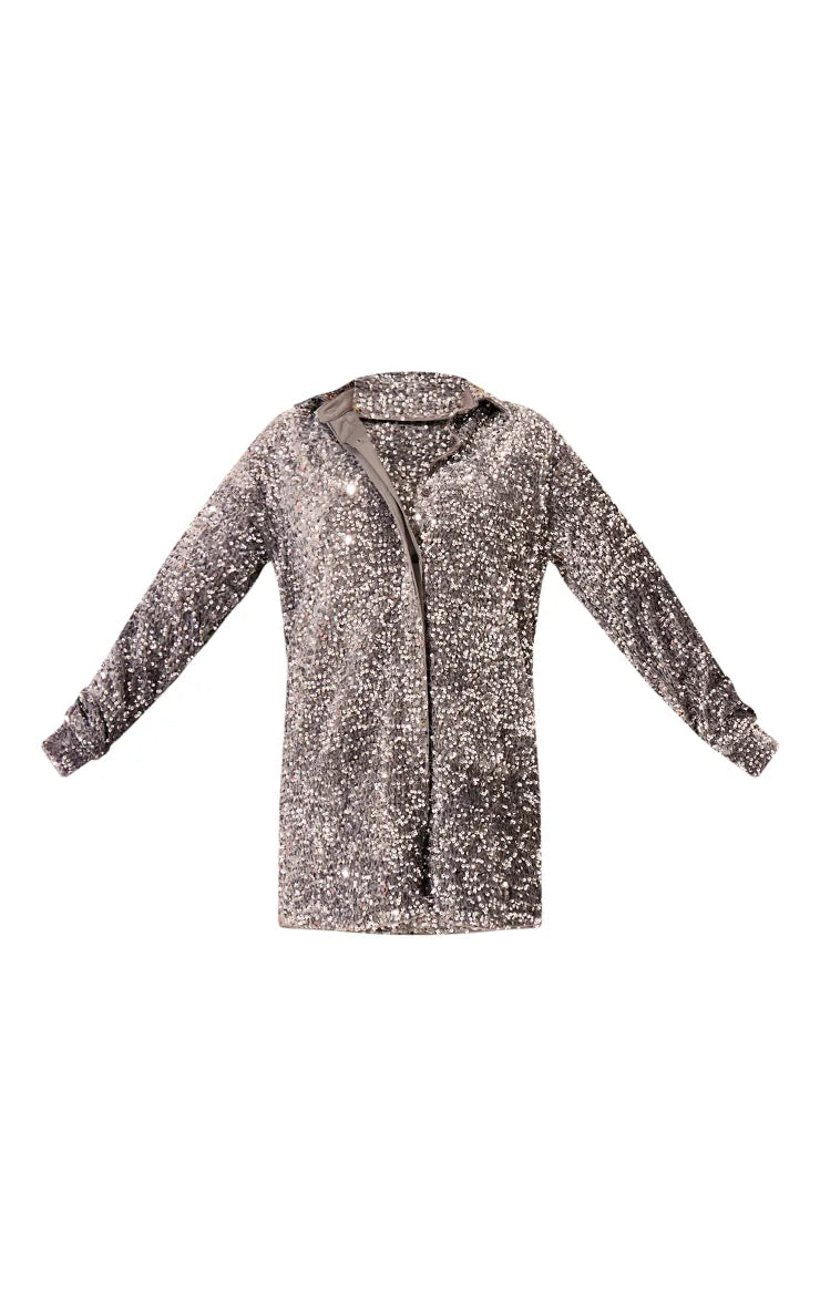 Elevate your after-dark aesthetic with this silver velvet sequin shirt dress. The considered silhouette is cut in an oversized fit, allowing for versatile styling – think cinched with a belt for definition or worn open as a directional layering piece. The tactile velvet base shimmers with light-catching sequins, offering a subtle yet impactful statement. Consider this a contemporary alternative to traditional occasion wear. Team with a pair of our barely-there heels for a considered, confident ensemble.