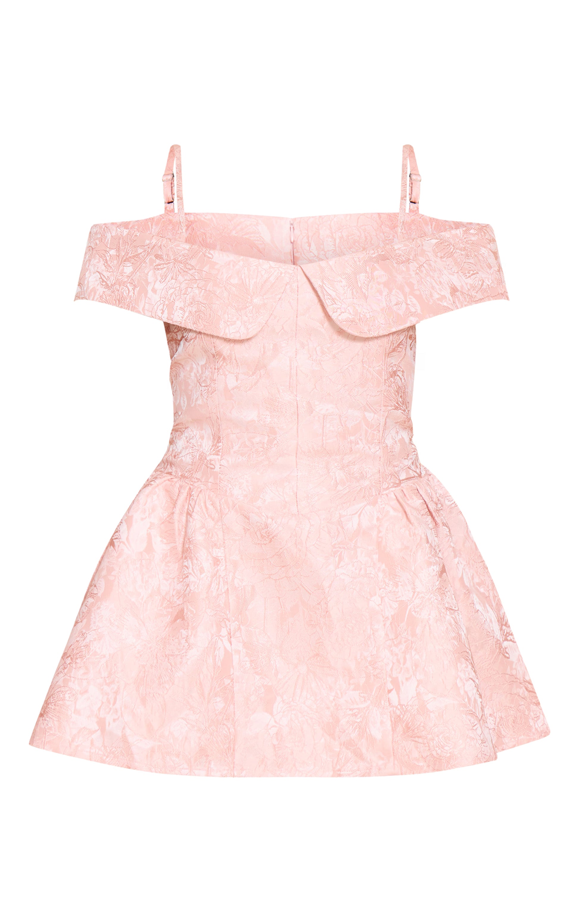 Channel romantic vibes in the blush jacquard bardot shift dress. Crafted from a blush textured jacquard material with a bardot neckline, it offers an effortless yet elegant silhouette. Style with mid height heels and minimal jewelry for a chic finish.