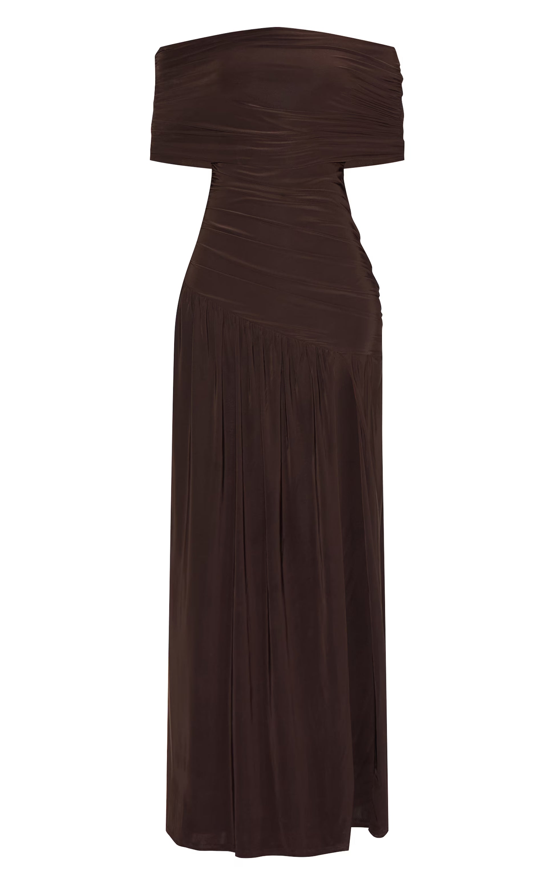 Chocolate Brown Double Layer Slinky Bardot One Shoulder Ruched Maxi Dress