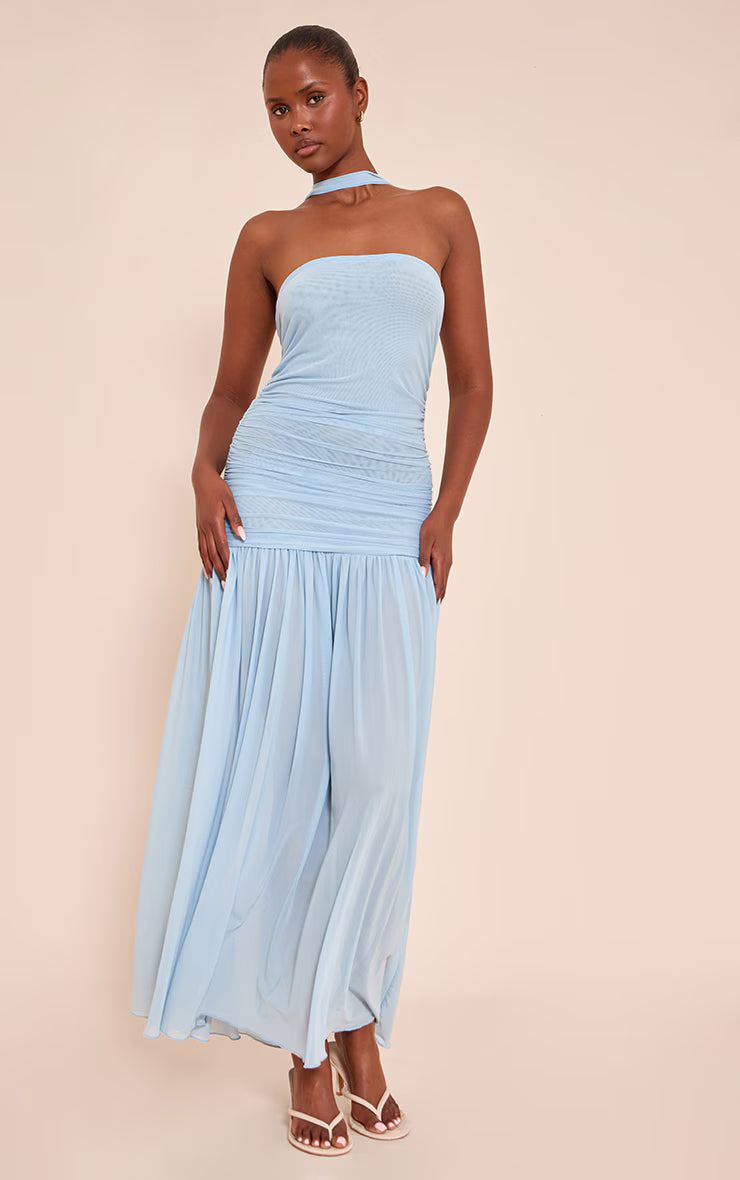 Light Blue Ruched Scarf Dropped Waist Maxi Dress