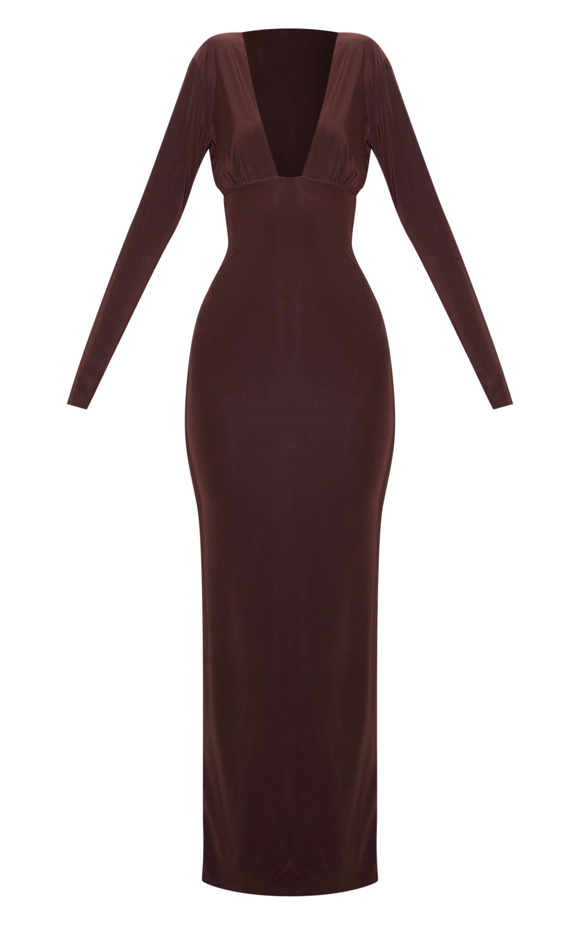 Crafted from a deep chocolate double-layered material with a deep plunge design and a flattering maxi length. Style this deep chocolate double layer deep plunge maxi dress with your fave heels and simple gold accessories for a chic finish.