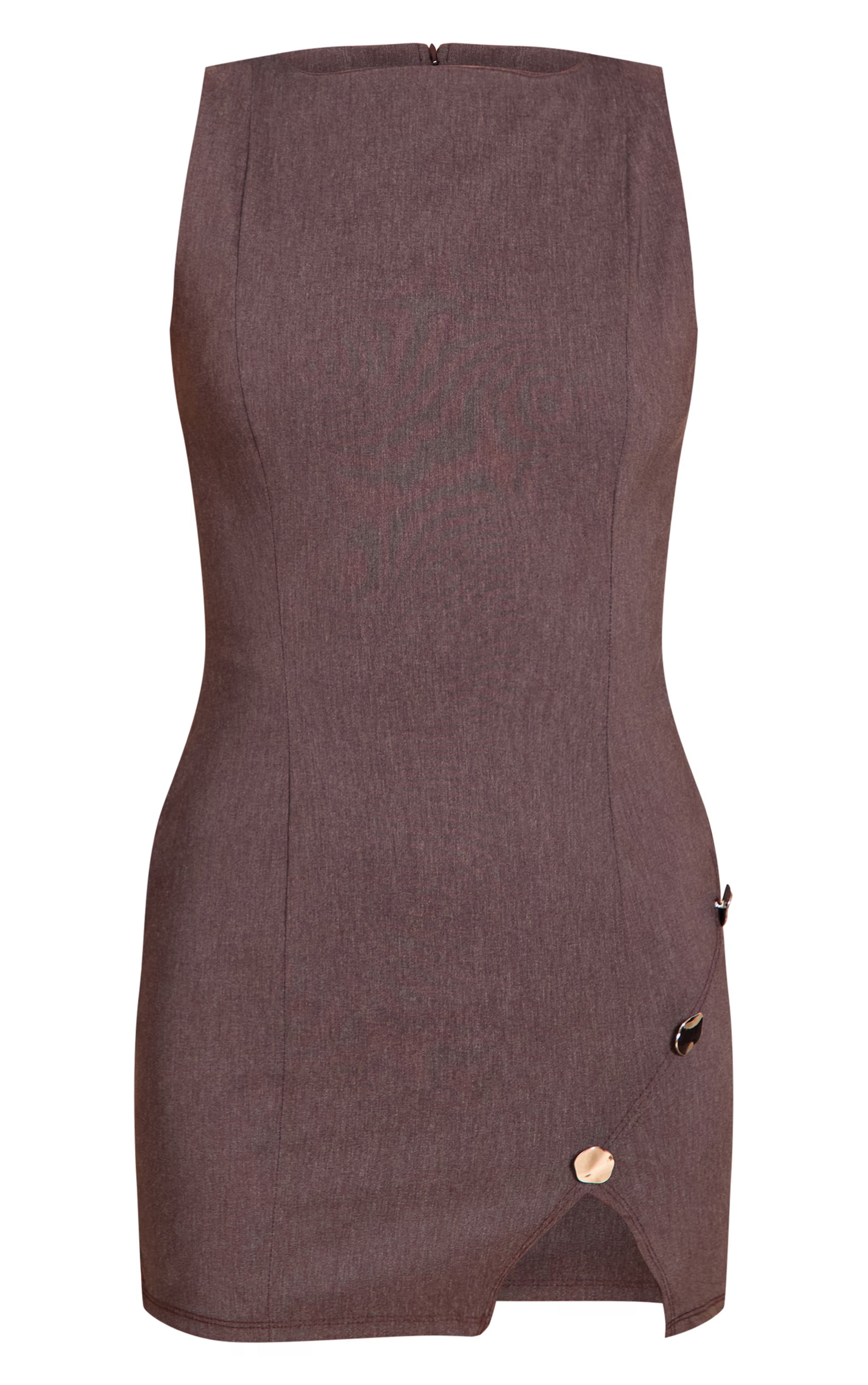 Precision meets conviction for your discerning day edit. The chocolate stretch woven trim detail bodycon dress presents a sleek, streamlined profile in a rich chocolate hue, featuring a sharp boat neckline and sleeveless cut that creates a clean upper line. A distinctive array of polished buttons traces one side, artfully shaping an asymmetric hem that commands attention. Pair it with sleek sneakers for a knowing casual edge, or elevate your night edit with strappy heels for understated impact.