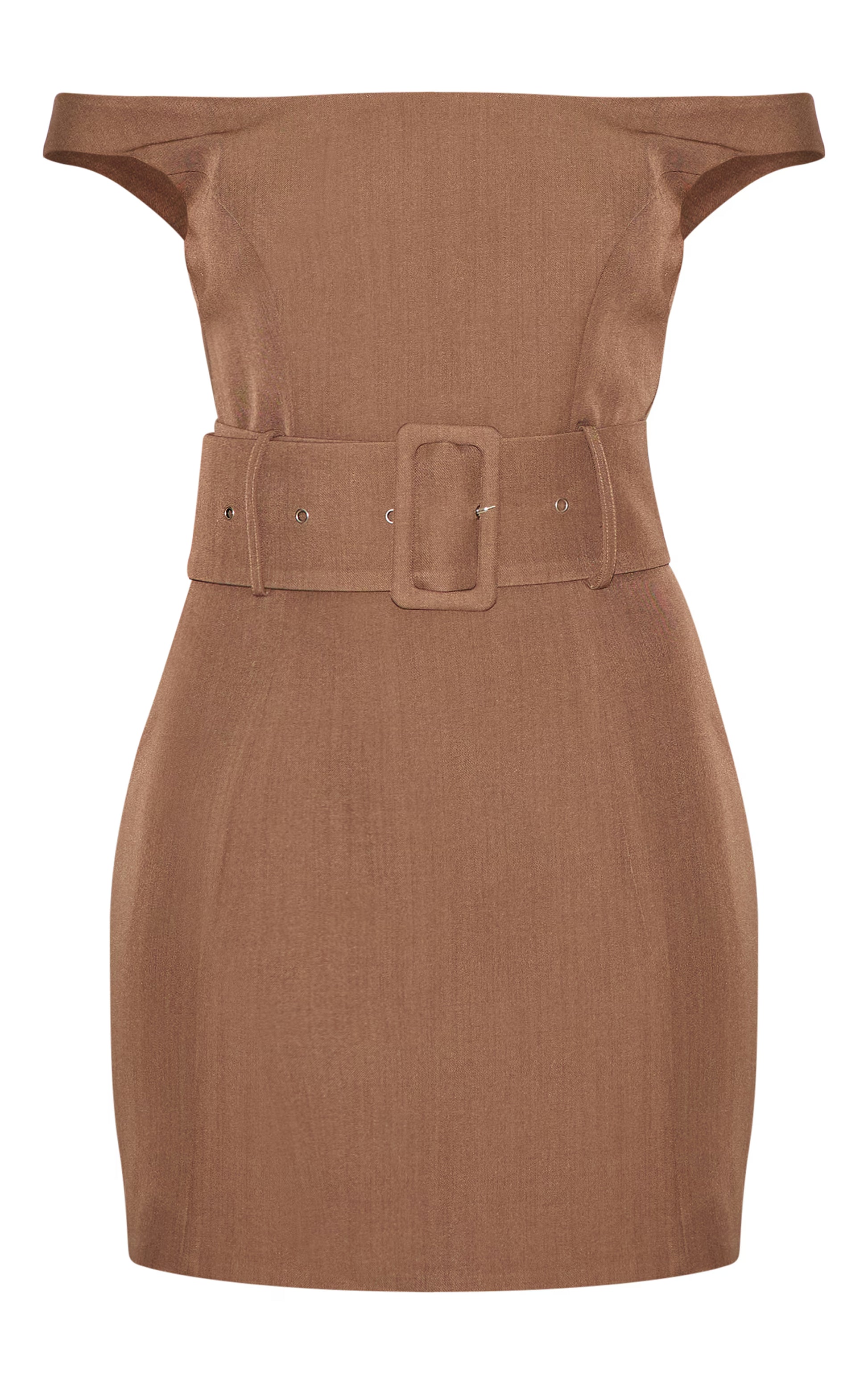 Taupe Woven Off Shoulder Belt Detail Mini Dress