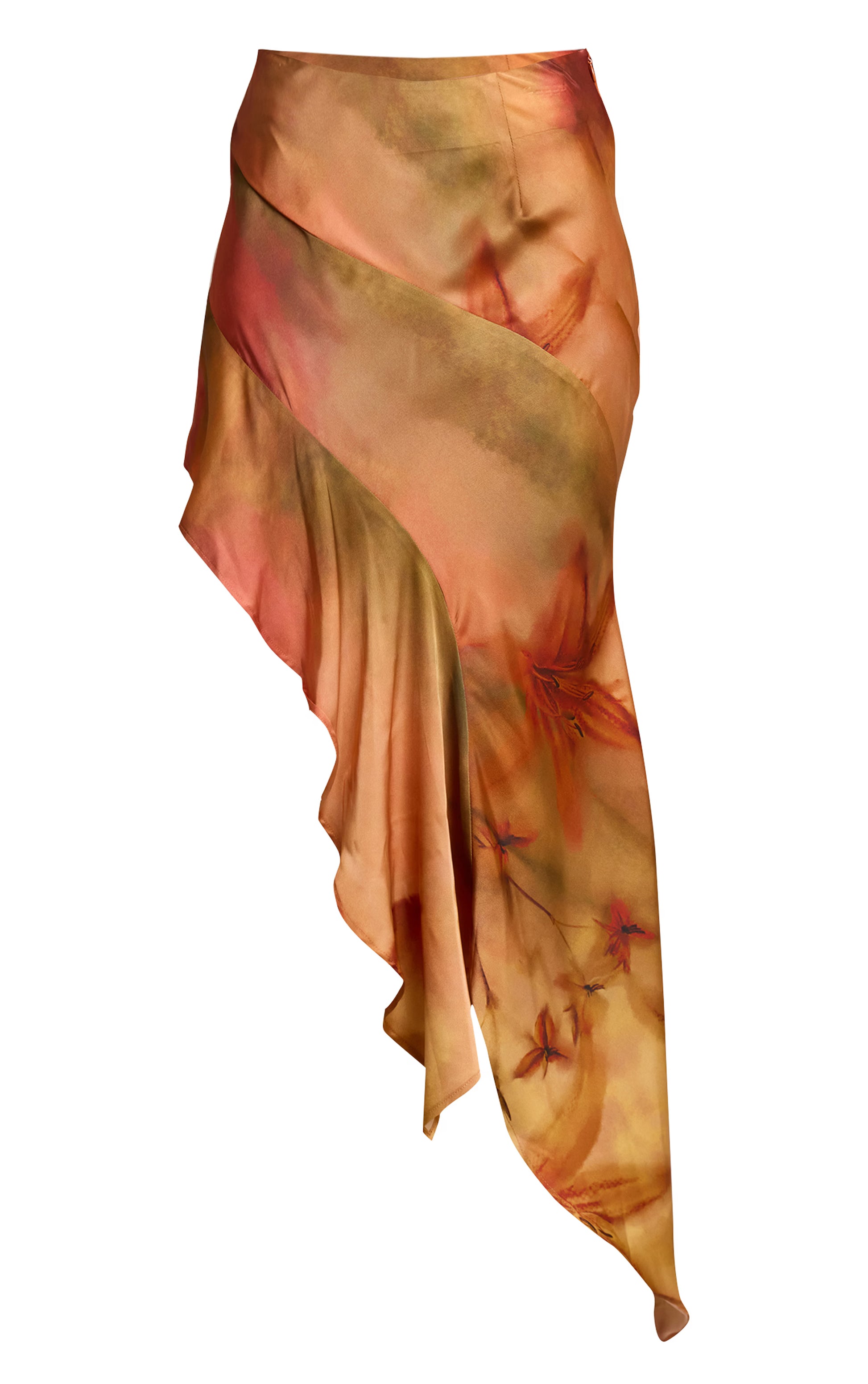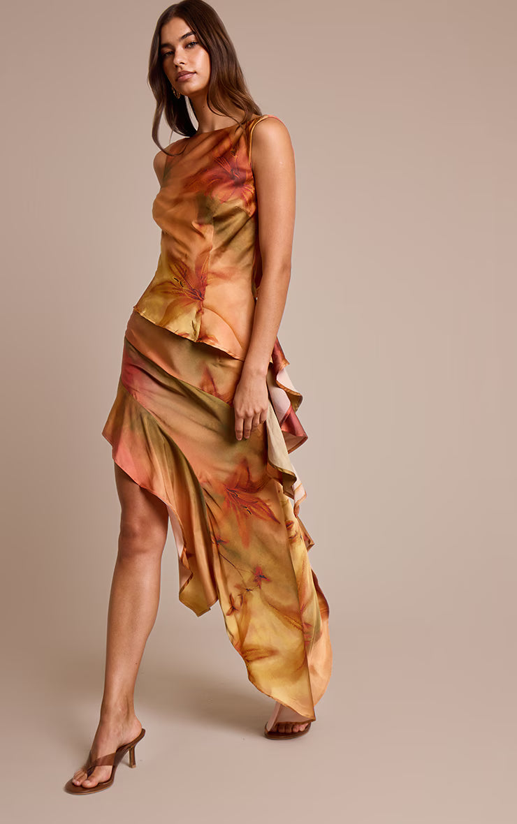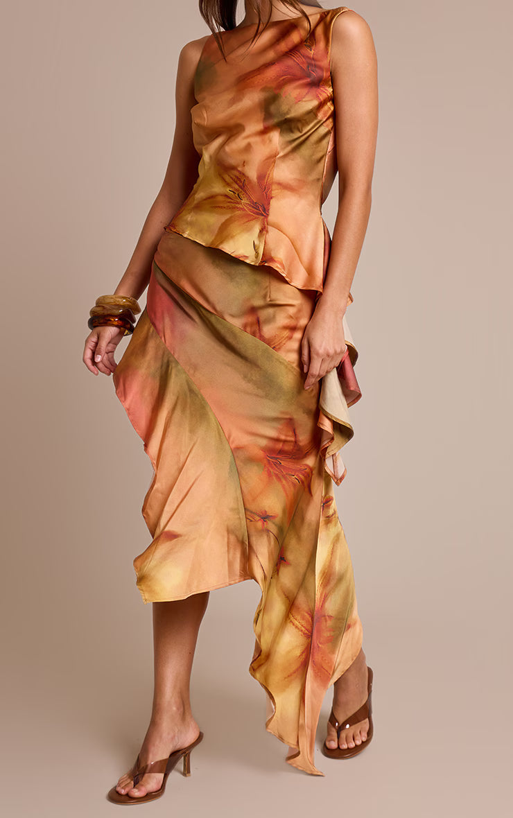 Burnt Orange Printed Satin Asymmetric Ruffle Midi Skirt