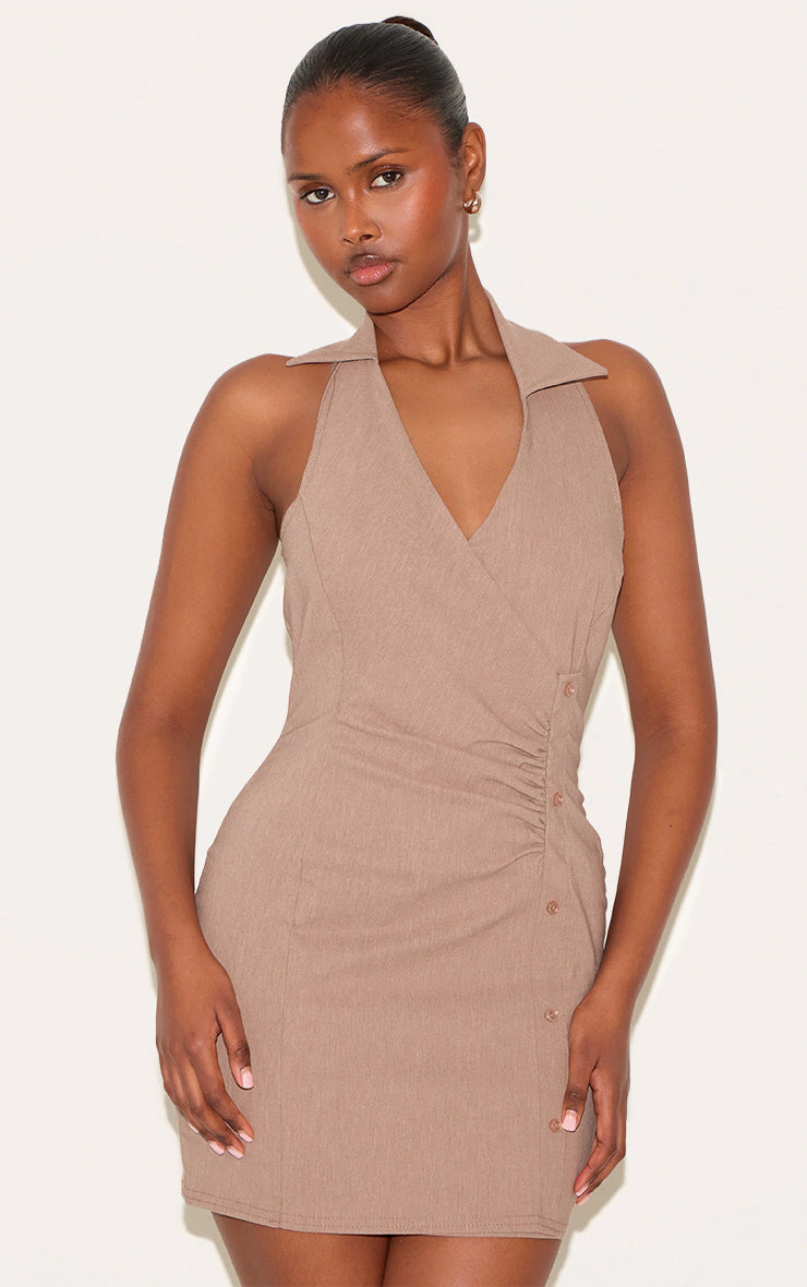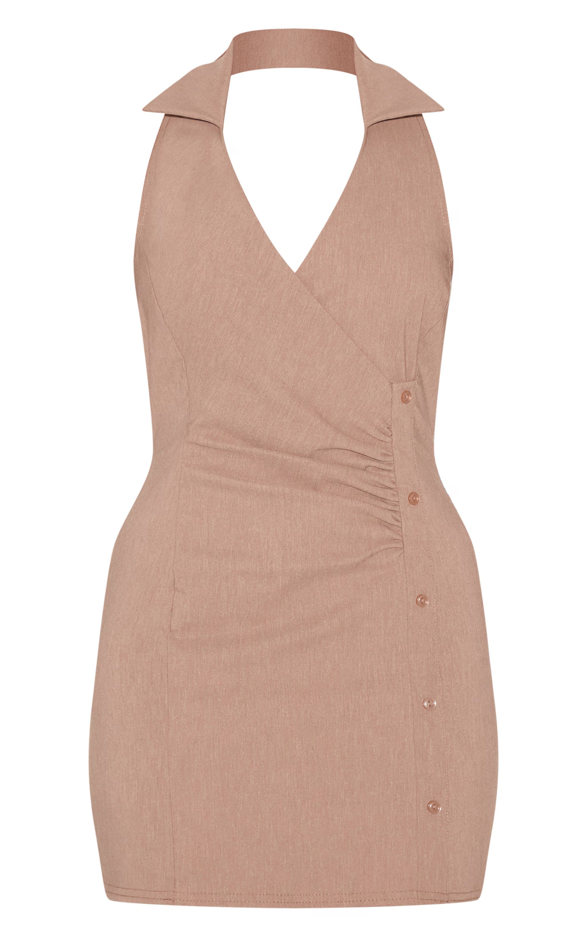Taupe Asymmetric Button Down Collar Detail Bodycon Dress