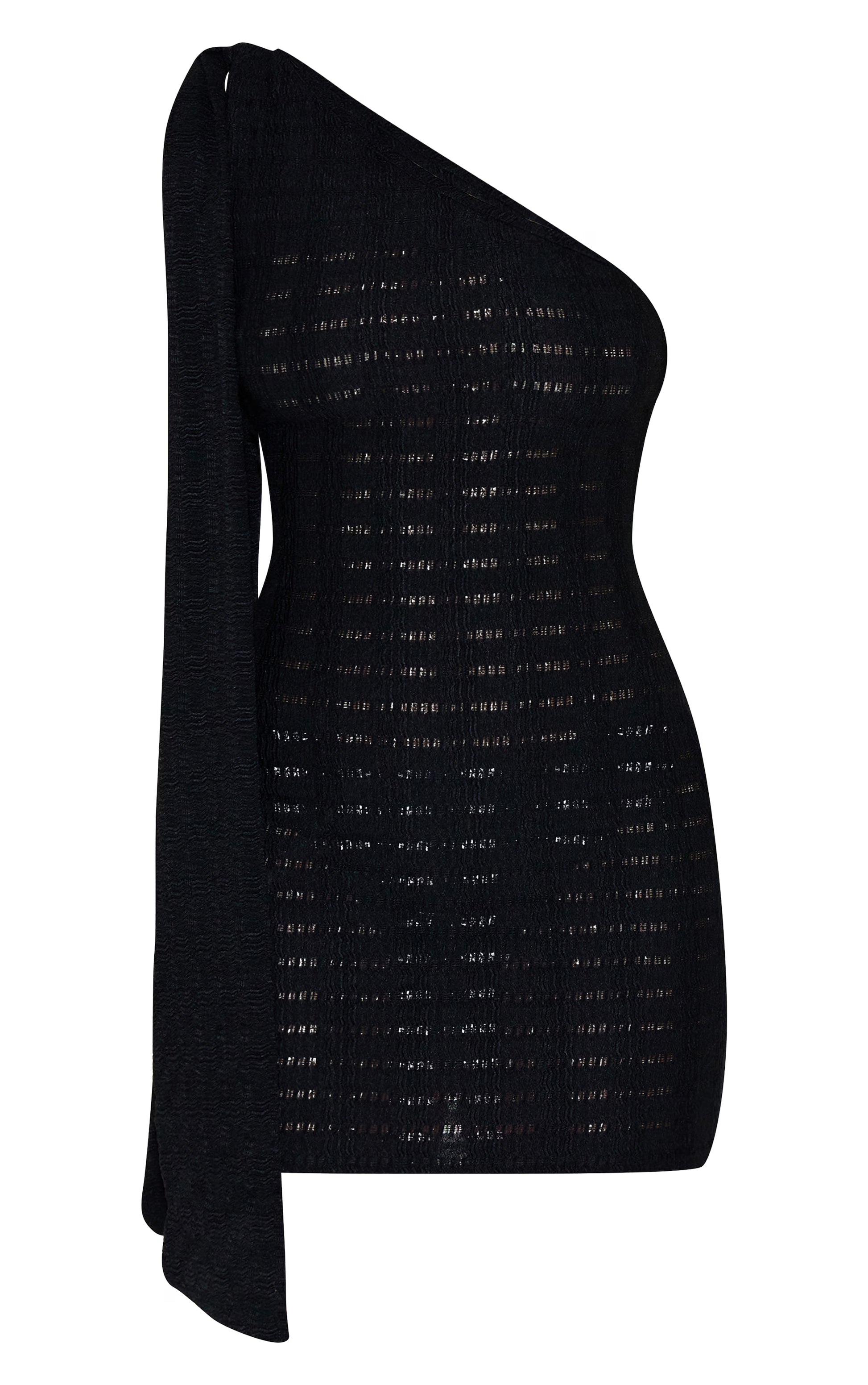 Black Textured One Shoulder Drape Detail Bodycon Dress