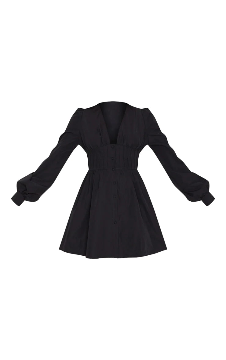 Black Button Front Fitted Puff Sleeve Skater Dress
