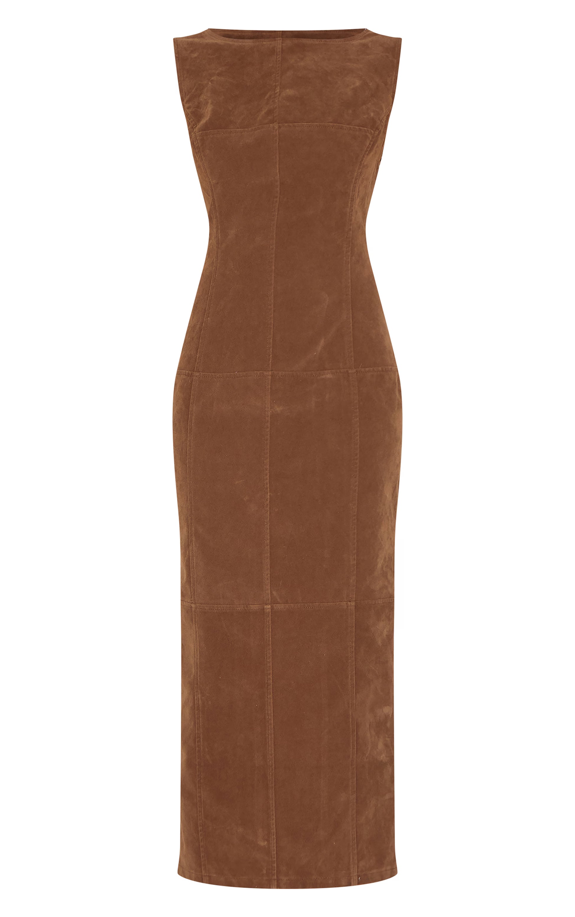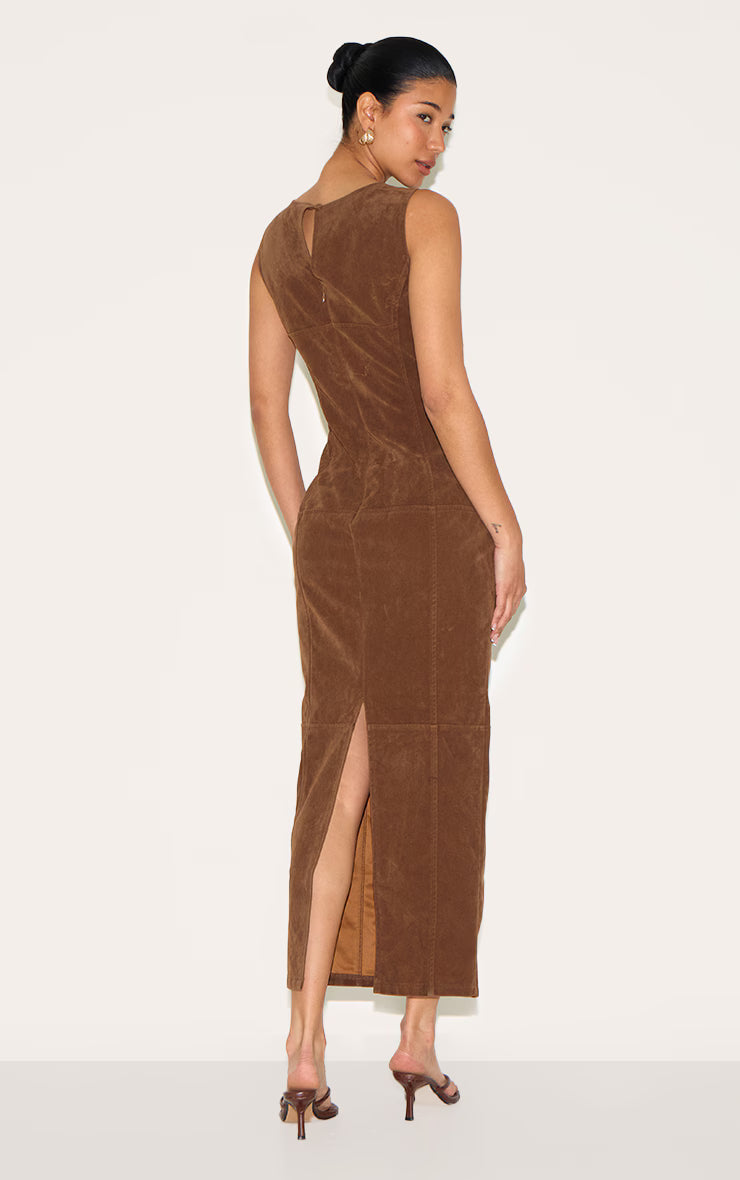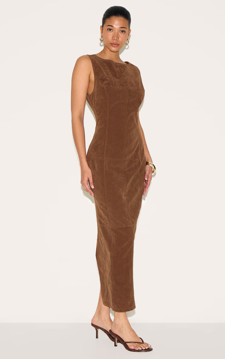 Embrace effortless elegance in this chestnut faux suede boat neck backless maxi dress. Crafted from chestnut faux suede material with a boat neck design and backless detailing for a striking, modern look. Team this maxi dress with a pair of heels and gold accessories to elevate your outfit.