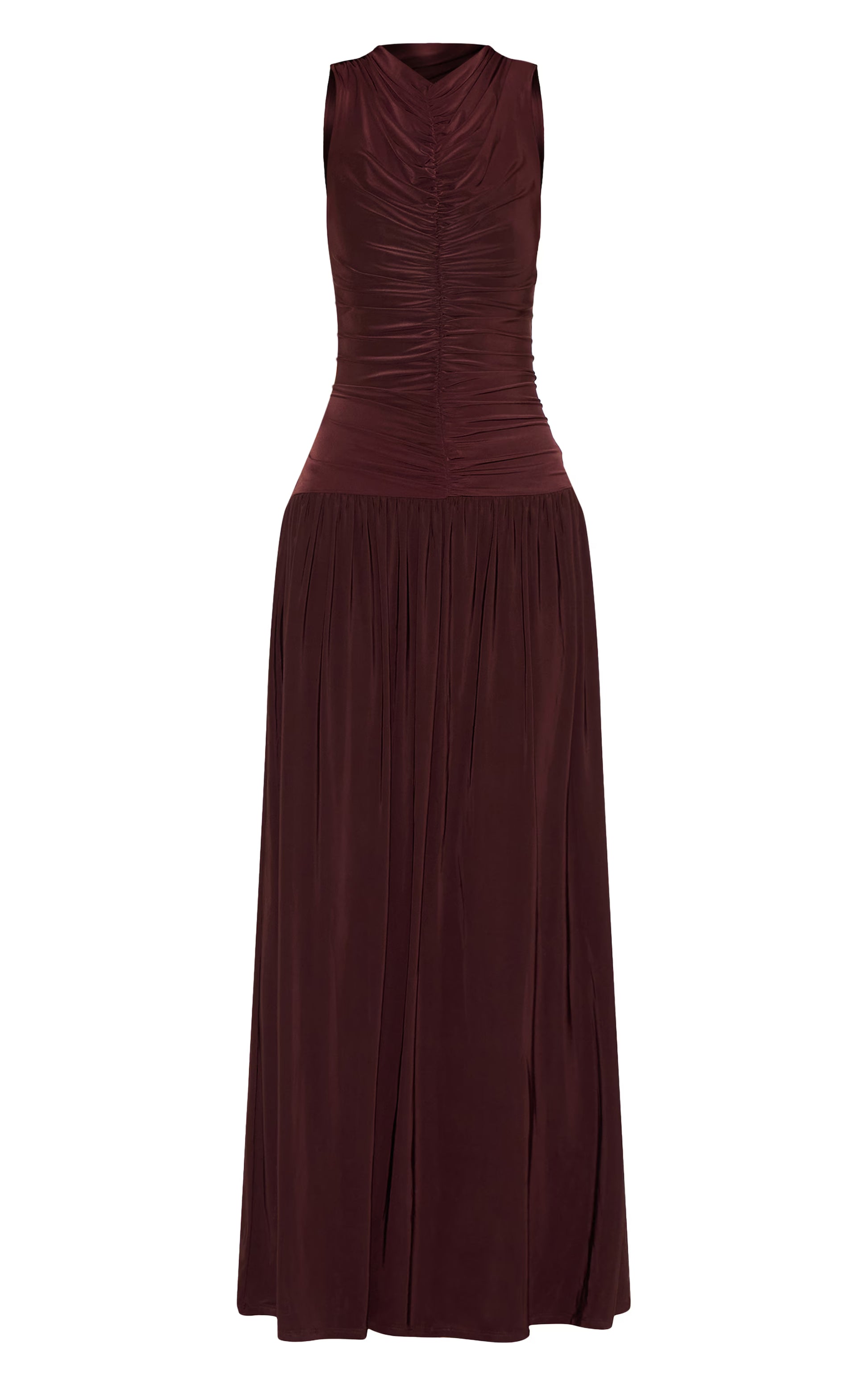 Chocolate Double Layer Soft Touch Drop Waist Ruched Maxi Dress