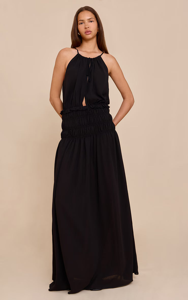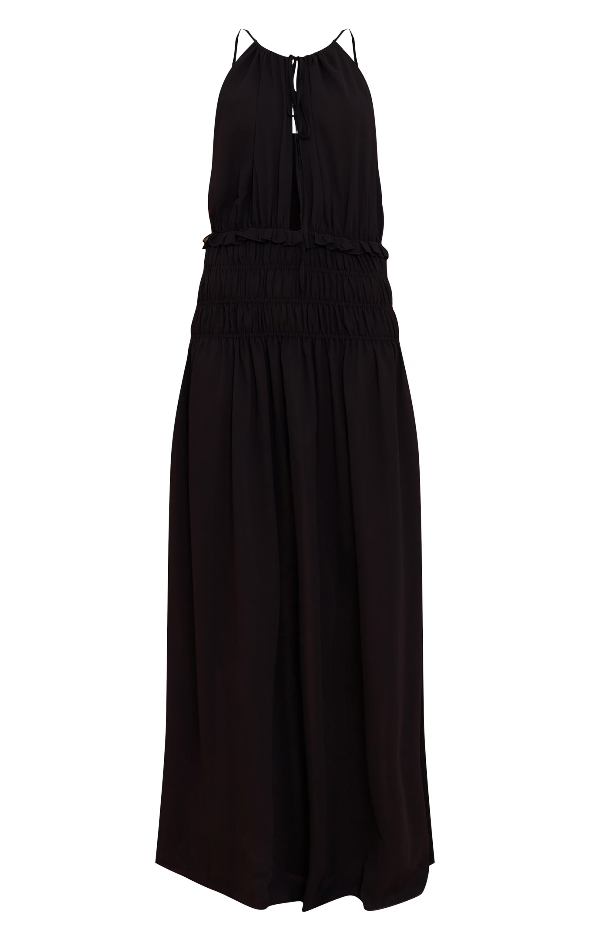 Introducing the black chiffon shirred maxi dress. Tailored from sleek black chiffon, this dress has a split front design with thin straps and a shirred finish. Match it with understated black heels and refined gold jewelry for a flawless evening look.