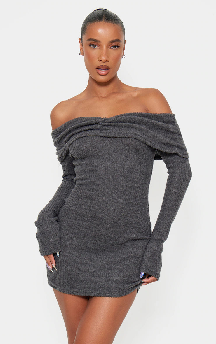 Grey Brushed Rib Bardot Long Sleeve Bodycon Dress