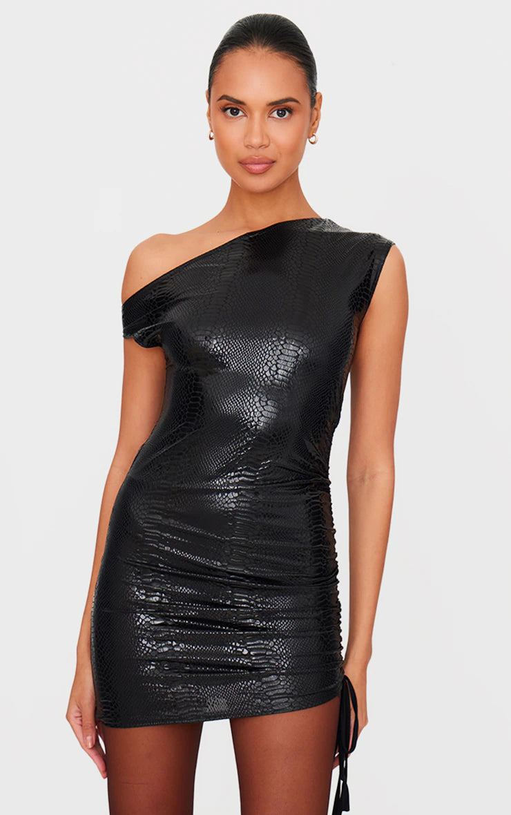 Embrace texture with this asymmetric mini dress, rendered in a contemporary croc-effect finish. The one-shoulder silhouette offers a directional take on after-dark dressing, demanding confidence and an appreciation for considered design. The subtly structured fabric skims the body, while maintaining a clean, minimalist aesthetic. Style it with a sculptural clutch from our accessories collection for a truly modern approach to evening wear.
