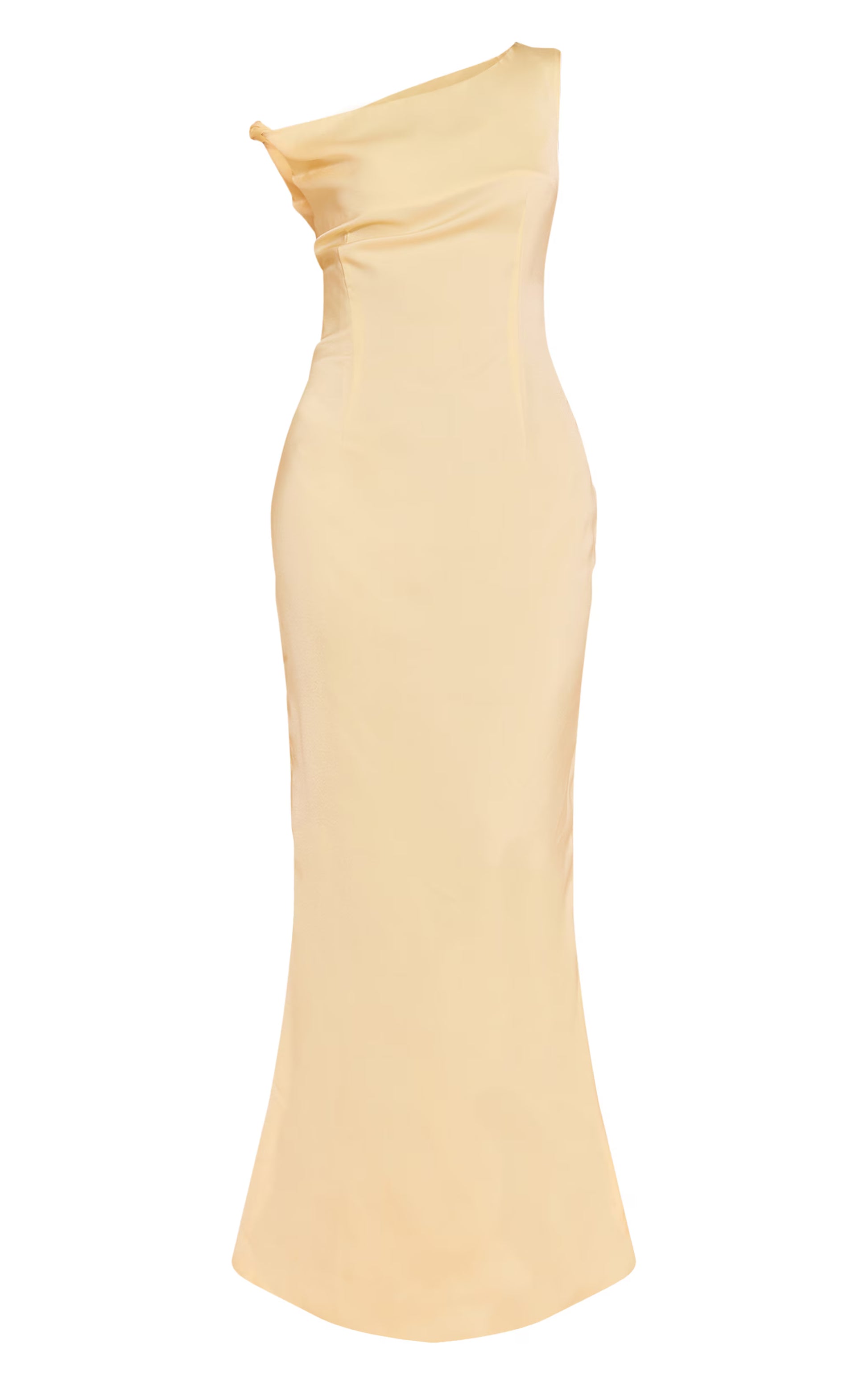 Introducing the lemon satin asymmetric bardot twist maxi dress. Crafted from lustrous satin, this dress features an asymmetric hem and bardot neckline with a twist detail for an elegant silhouette. Pair with statement earrings and strappy heels to complete the look.