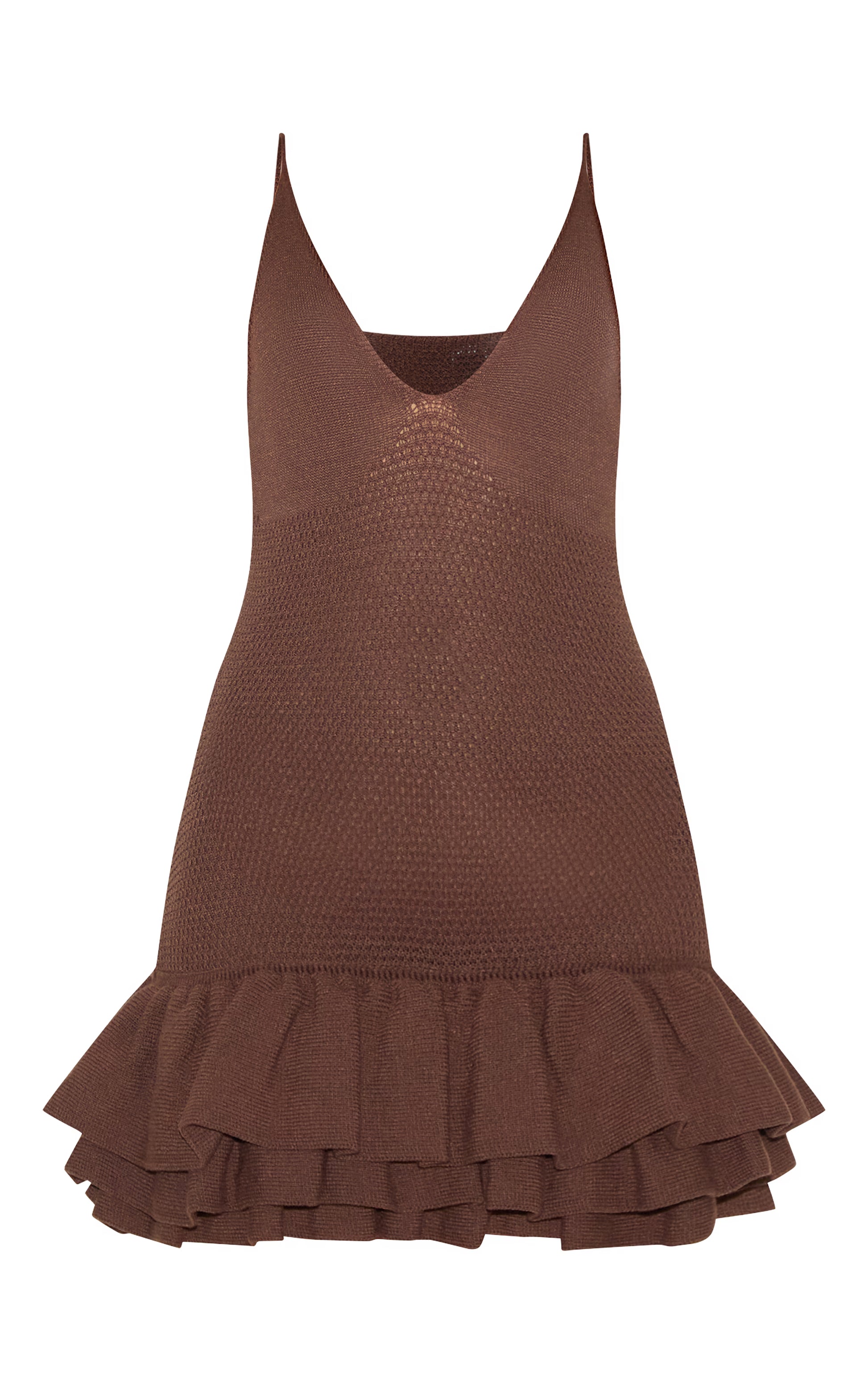 Chocolate Knitted Frill Hem Strappy Mini Dress