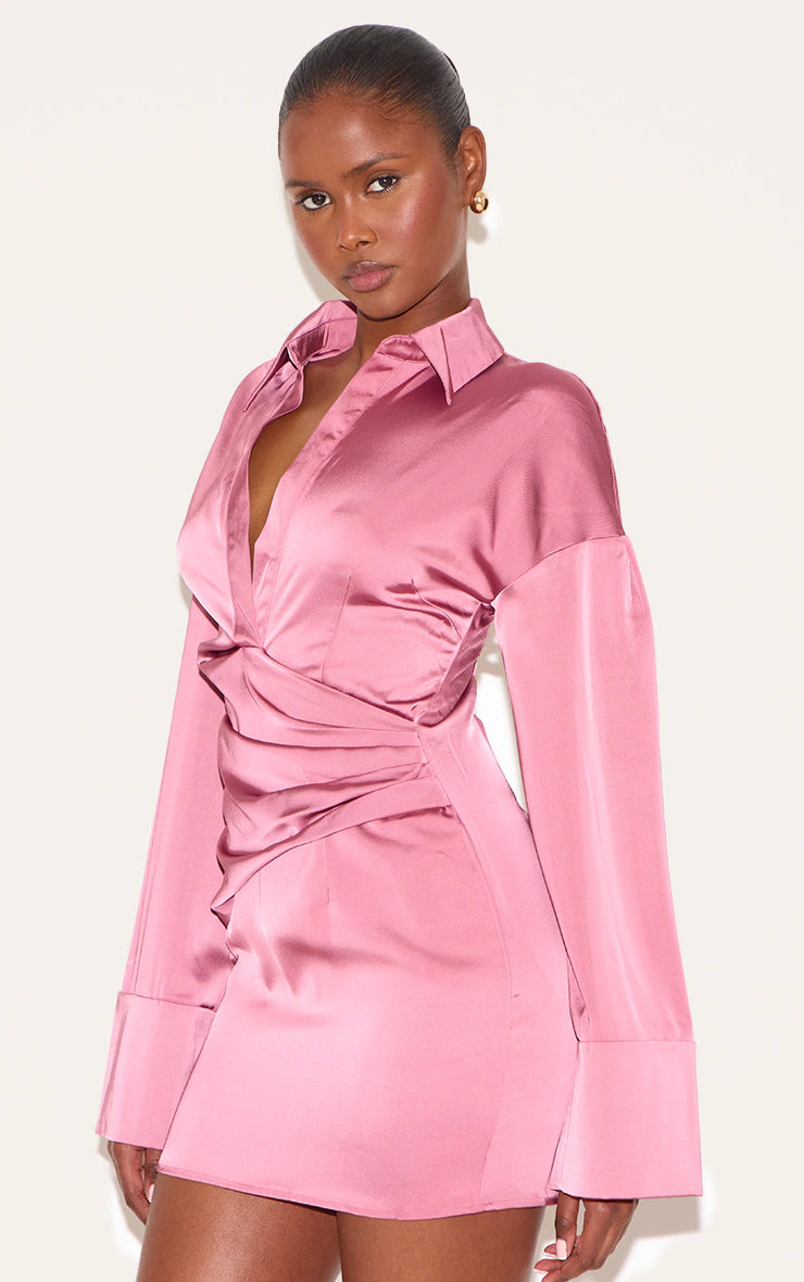 Blush Rose Premium Satin Bell Sleeve Shirt Dress
