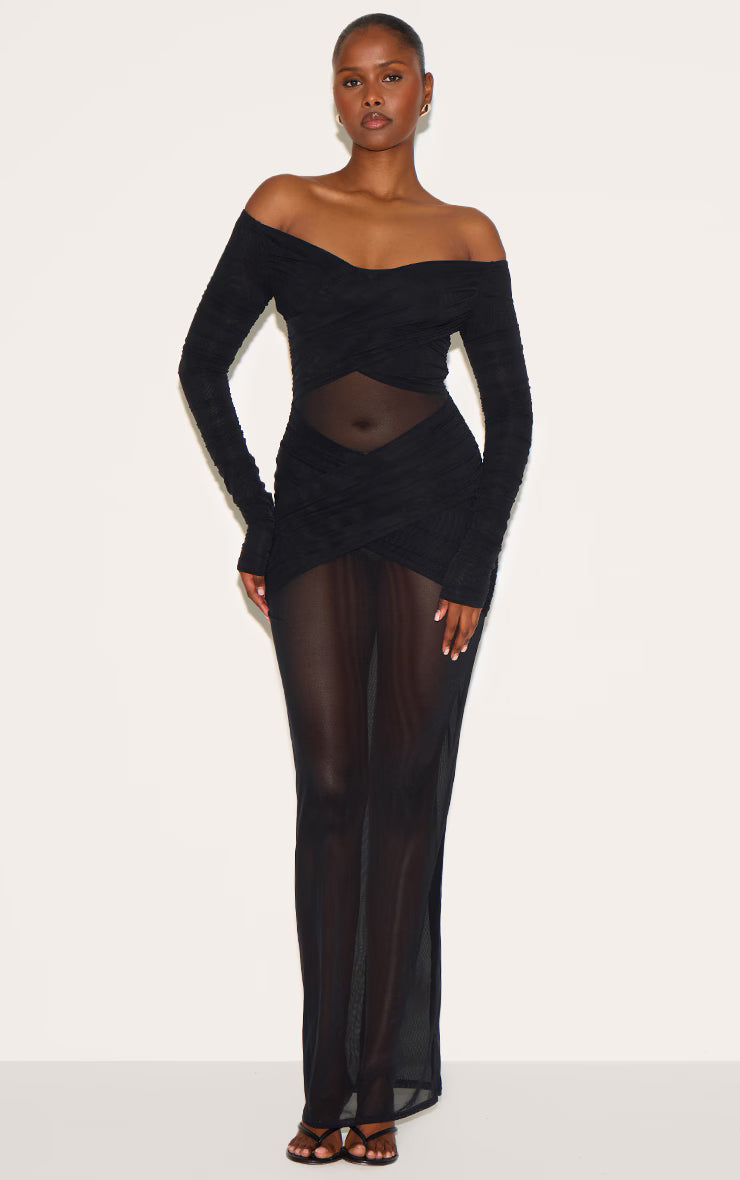 Black Bandage Mesh Bardot Layered Ruched Maxi Dress