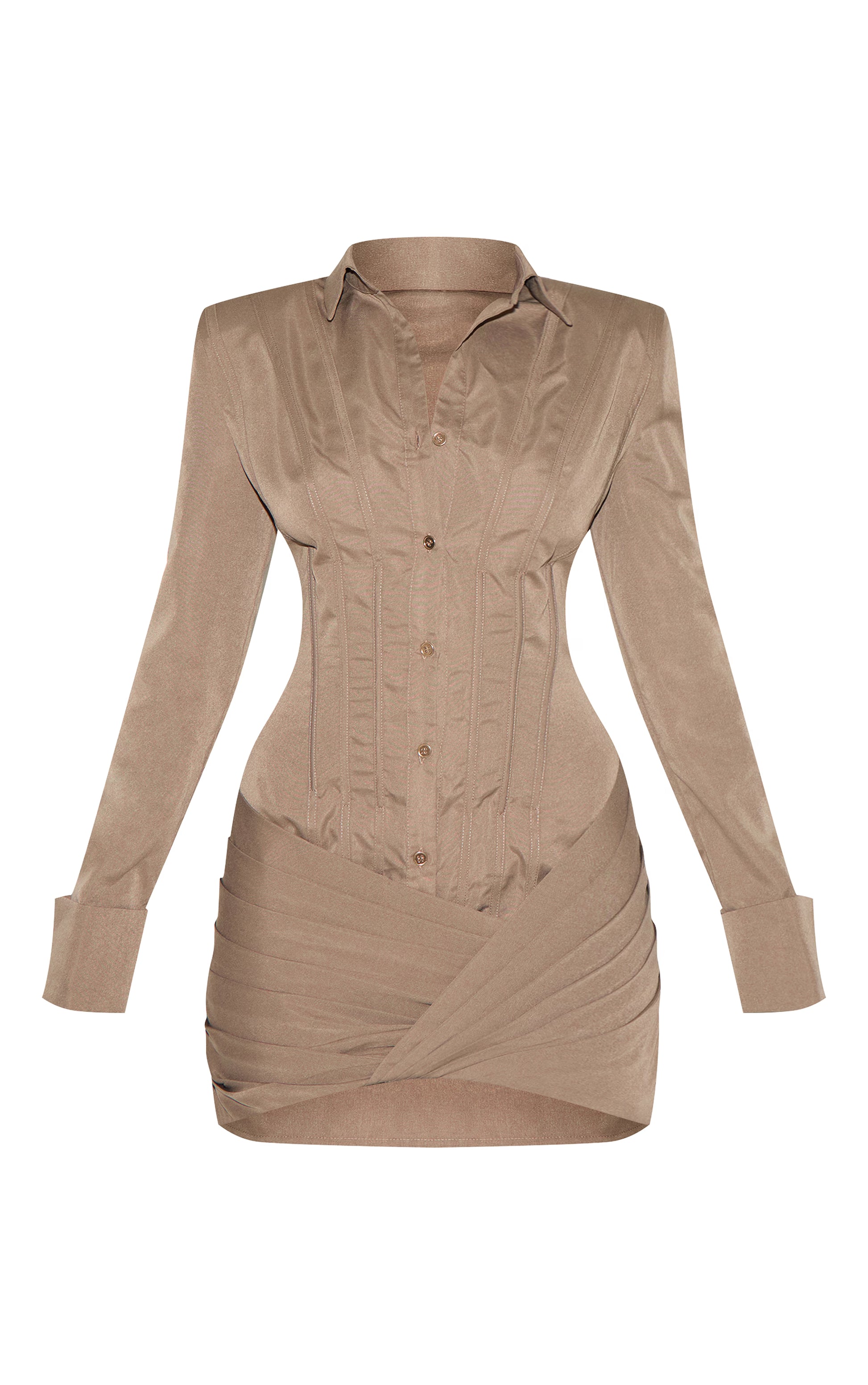 Take your look to the next level in this mushroom structured woven wrap shirt dress. Crafted from mushroom hue material, this dress has a corseted bodice structure with a wrap skirt, padded shoulders and button fastenings. For the ultimate finish, add barely-there heels and gold hoop earrings.
