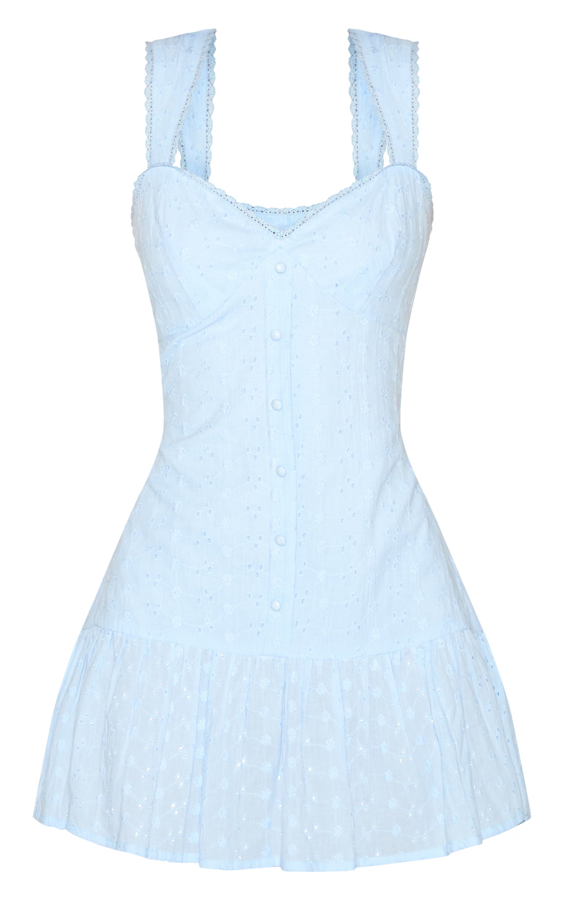 Soft pastels anchor confident day style. The Pale Blue Embroidered Button Down Sleeveless Shift Dress offers a knowing cut in delicate pale blue, featuring intricate eyelet embroidery woven into the fabric. It shapes a defined sweetheart neckline and functional button-down front, falling to a mini skirt completed with an artful ruffle hemline. Pair this essential piece with minimalist flat sandals or clean sneakers and a simple tote bag for an effortlessly polished look ready for sunlit hours.