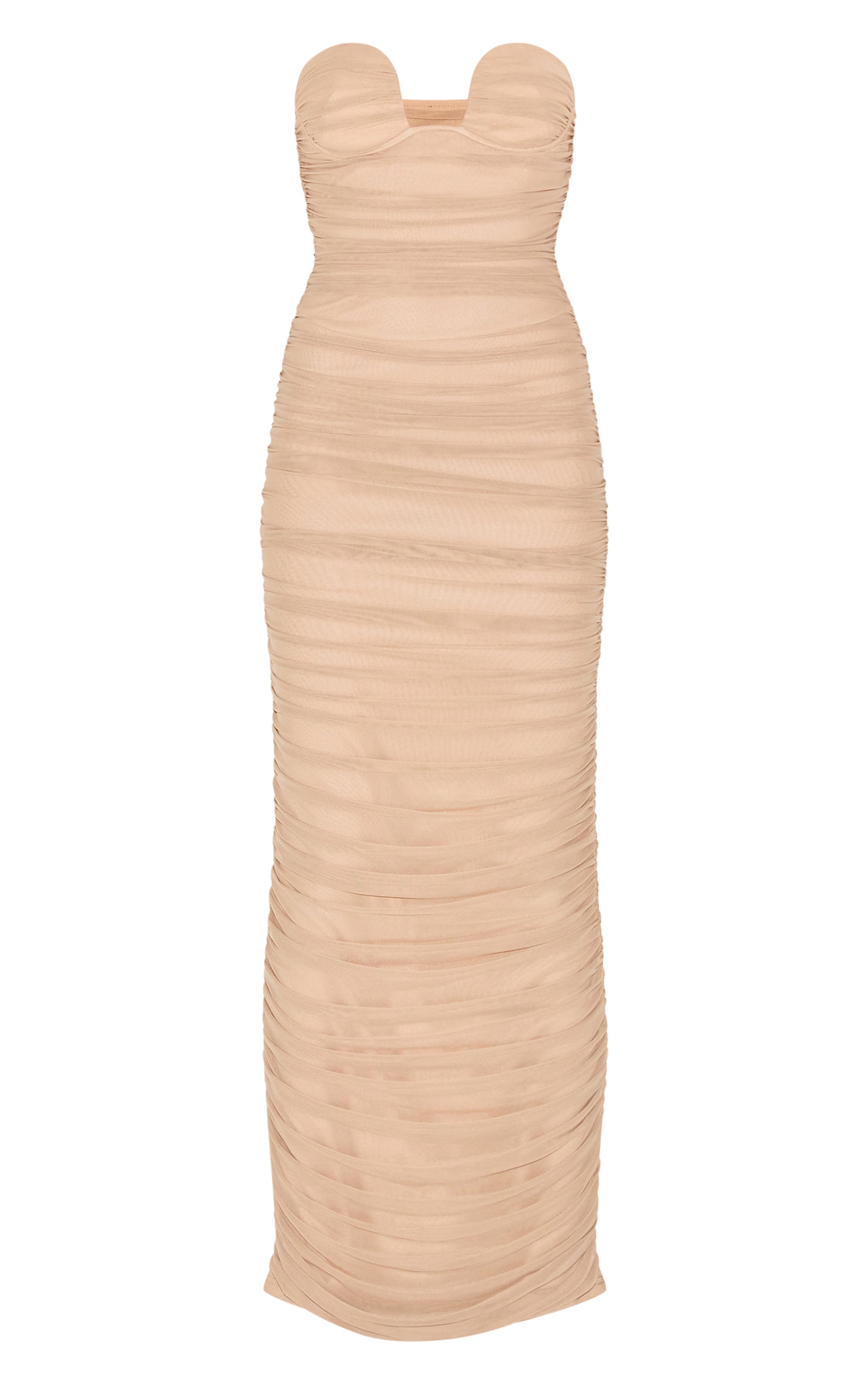 Keep it chic in this mushroom mesh ruched bandeau maxi dress. Made from a mushroom hue mesh material with a ruched design, a bandeau neckline and a maxi length. Style this maxi dress with court heels and minimal accessories for a look they won't be able to take their eyes off.