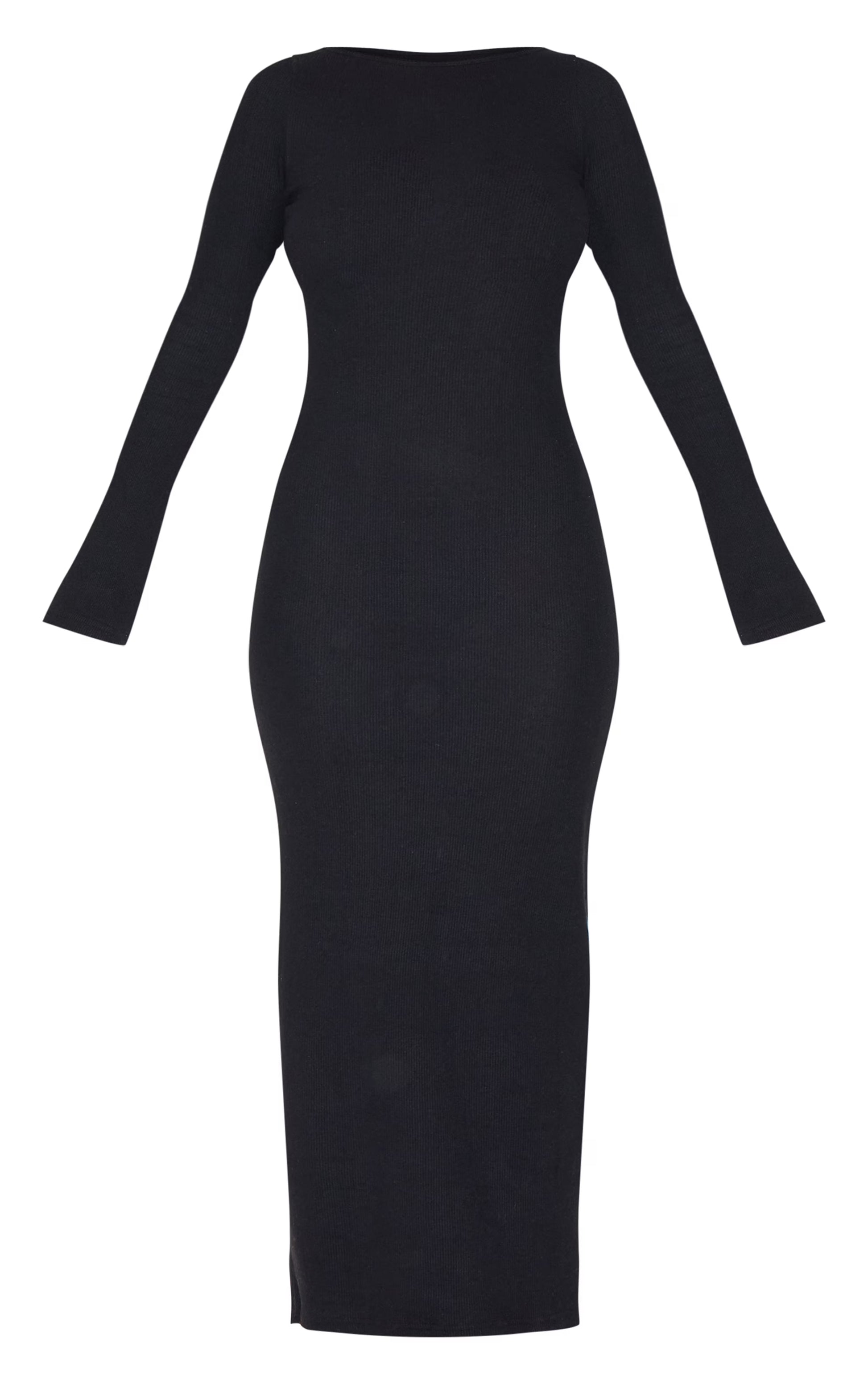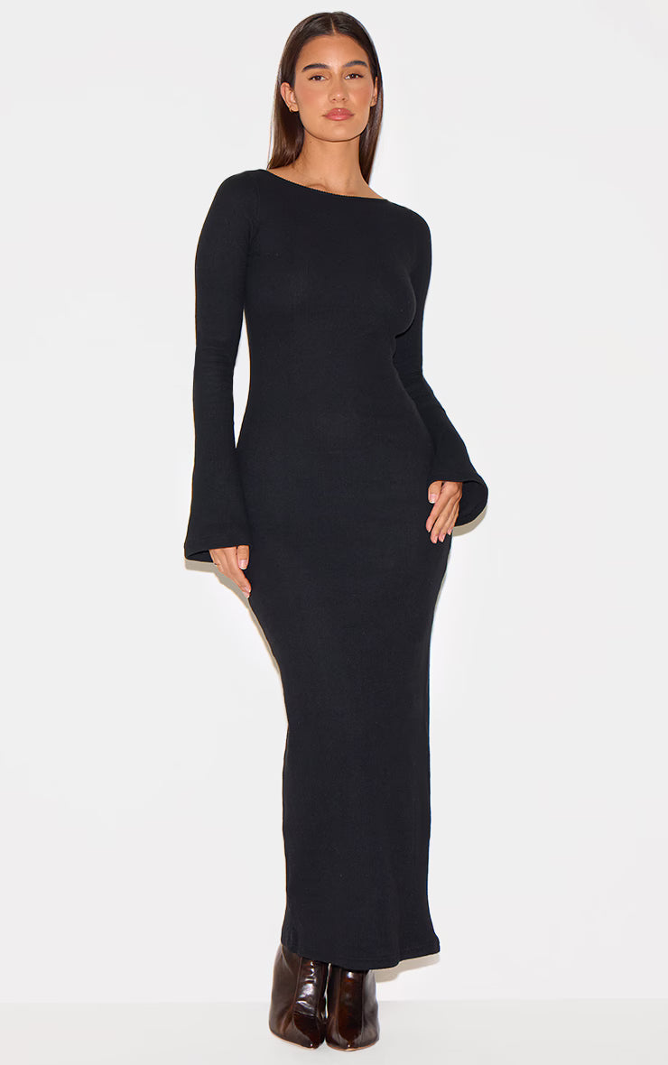 Black Heavy Brushed Rib Flared Sleeve Maxi Dress