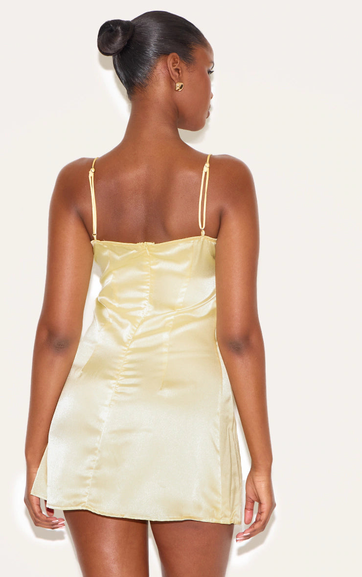 Made from a butter yellow satin material with a flattering mini length and strappy detailing. Team this butter yellow satin shift dress with a pair of strappy stiletto heels and some gold accessories for a look that will have heads turning no matter what the occasion.