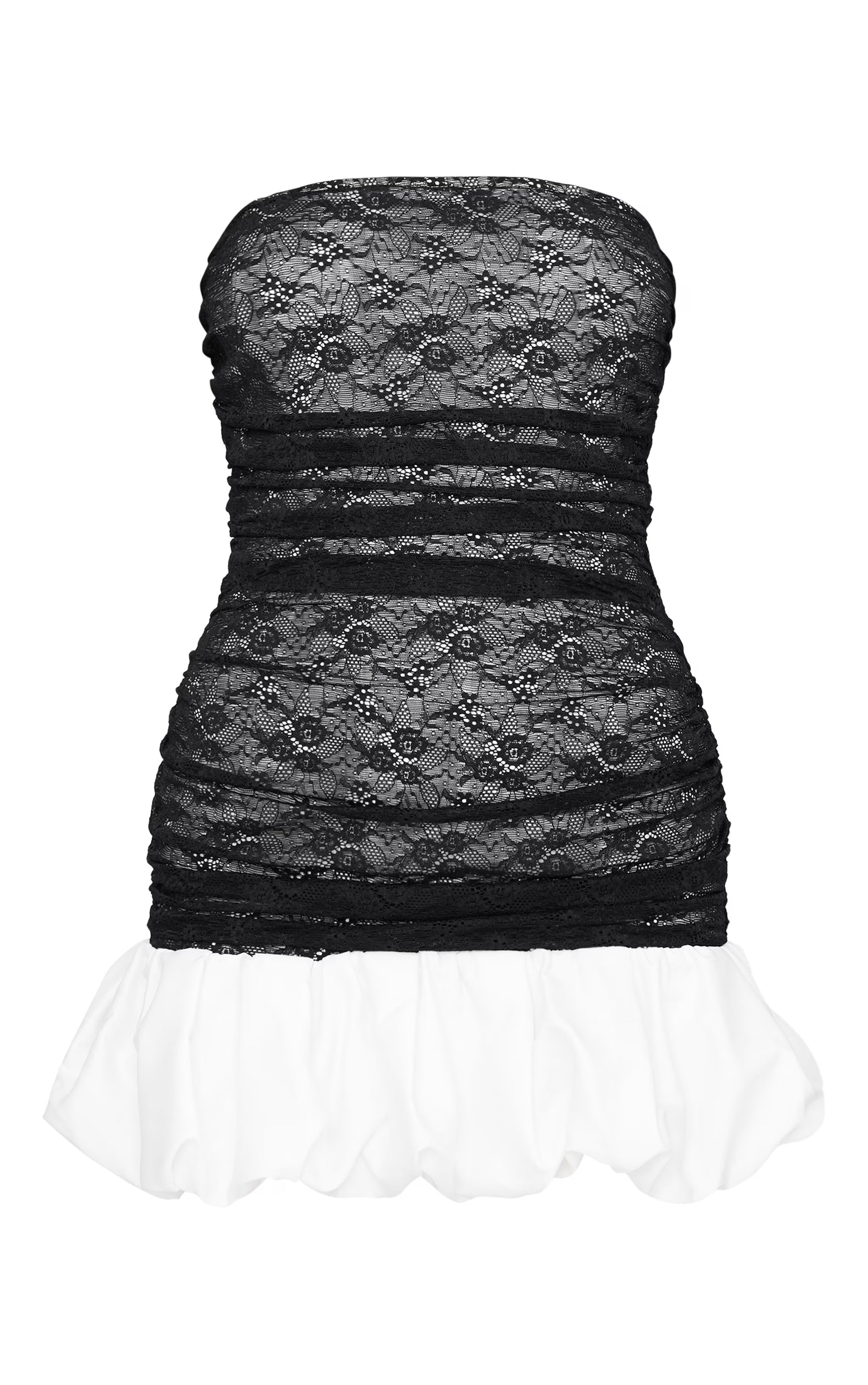 Refine your evening edit with this black lace bandeau mini dress, a study in texture and form. The delicate lace overlay offers a tactile contrast to the structured bandeau bodice, while the puff hem introduces a hint of considered volume. Accentuate the dress's architectural silhouette with a sculptural clutch from our accessories collection for a confident after-dark statement.