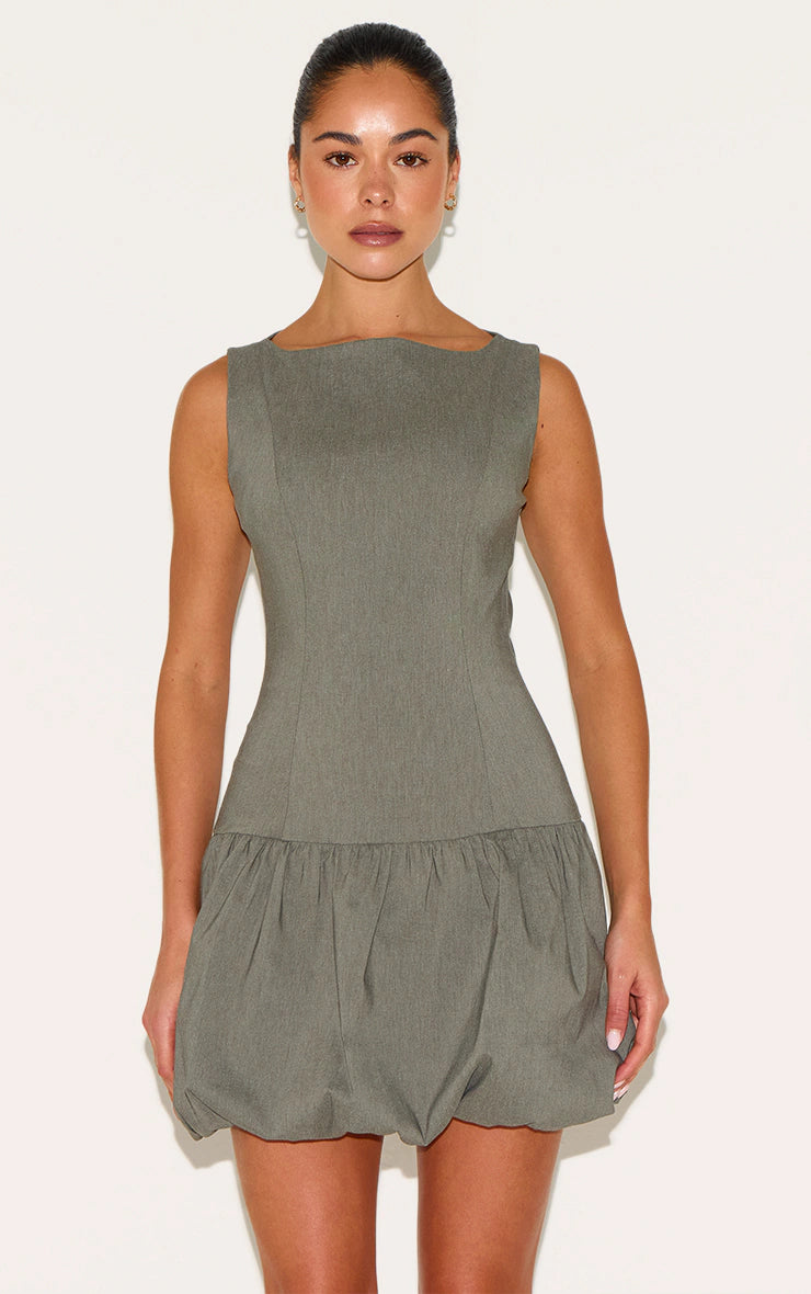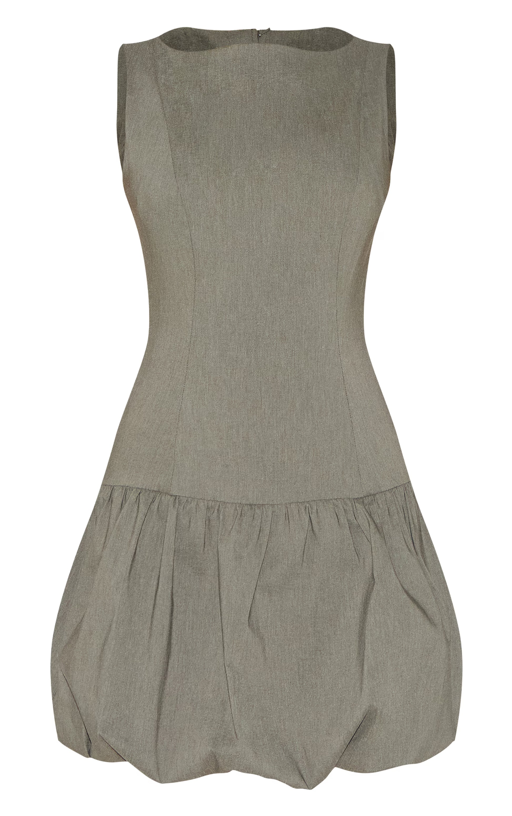 Crafted from khaki stretch woven material with a fashion-forward puffball skirt and a feminine mini length fit. For a unique look this Spring, pair this khaki stretch woven puffball dress with simplistic gold earrings and strappy sandal heels.