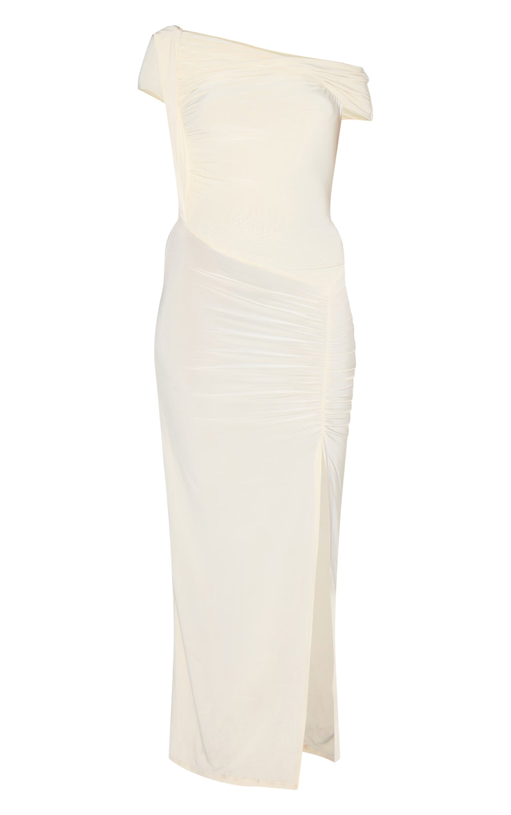 Crafted from butter yellow slinky material, this dress has twist detailing at the neckline, asymmetrical shoulder draping, a deep side split and a maxi length fit. For the perfect occasion look, wear this butter yellow slinky twist detail maxi dress with strappy stiletto heels and your go-to gold jewelry.