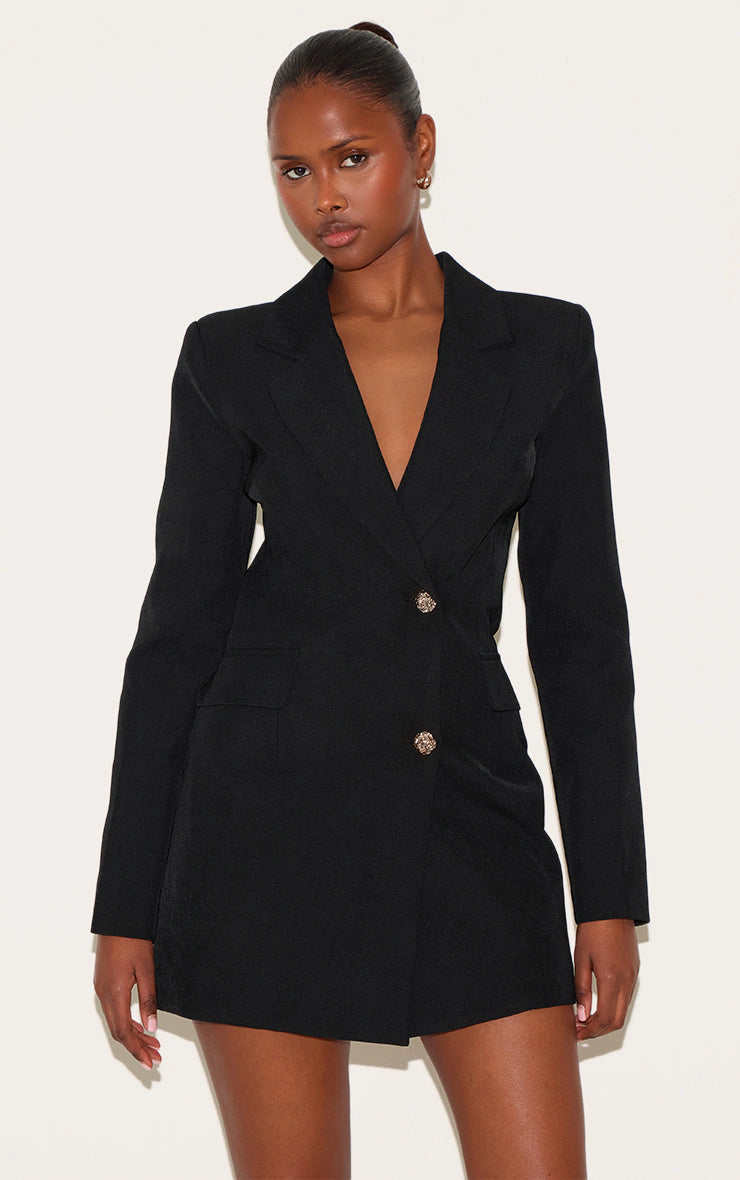 Keep it effortlessly chic in this black tailored gold button blazer dress. Made from a black material with a tailored design, a gold button detailing and a long sleeve fit. Team with a pair of heels and gold earrings to finish off the look we are loving.