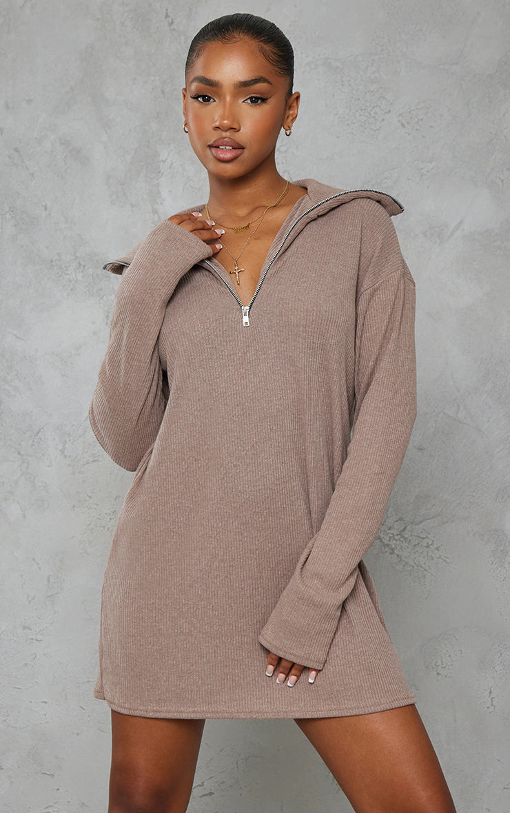 Mocha Rib High Neck Half Zip Oversized Sweater Dress