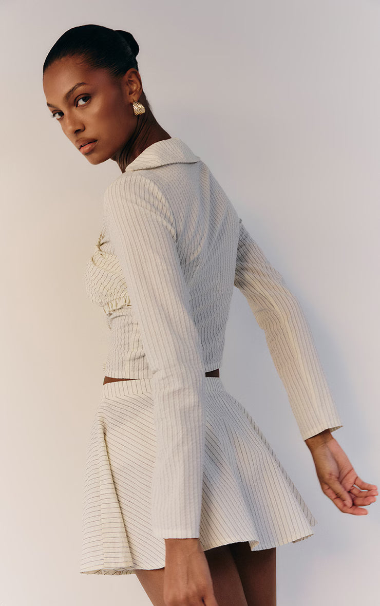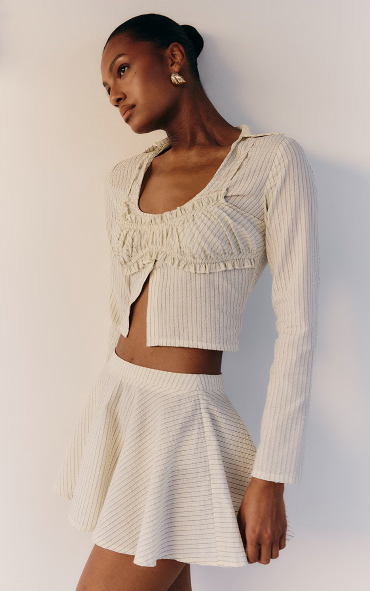 Brought to you in a cream hue pinstripe seersucker material with unique flippy detailing and a stylish mini length fit. Add a touch of uniqueness to your wardrobe this season with the cream pinstripe seersucker flippy mini skirt, and pair it with a neutral top, refined strappy heels and sleek gold earrings.