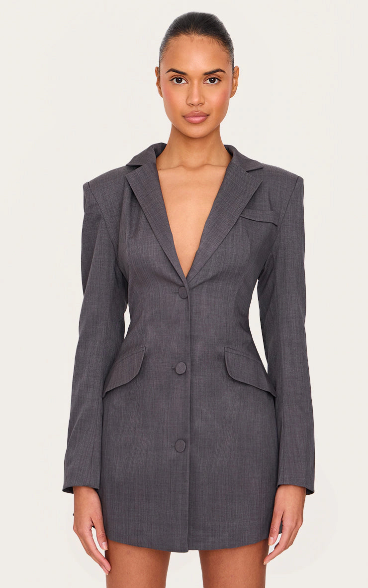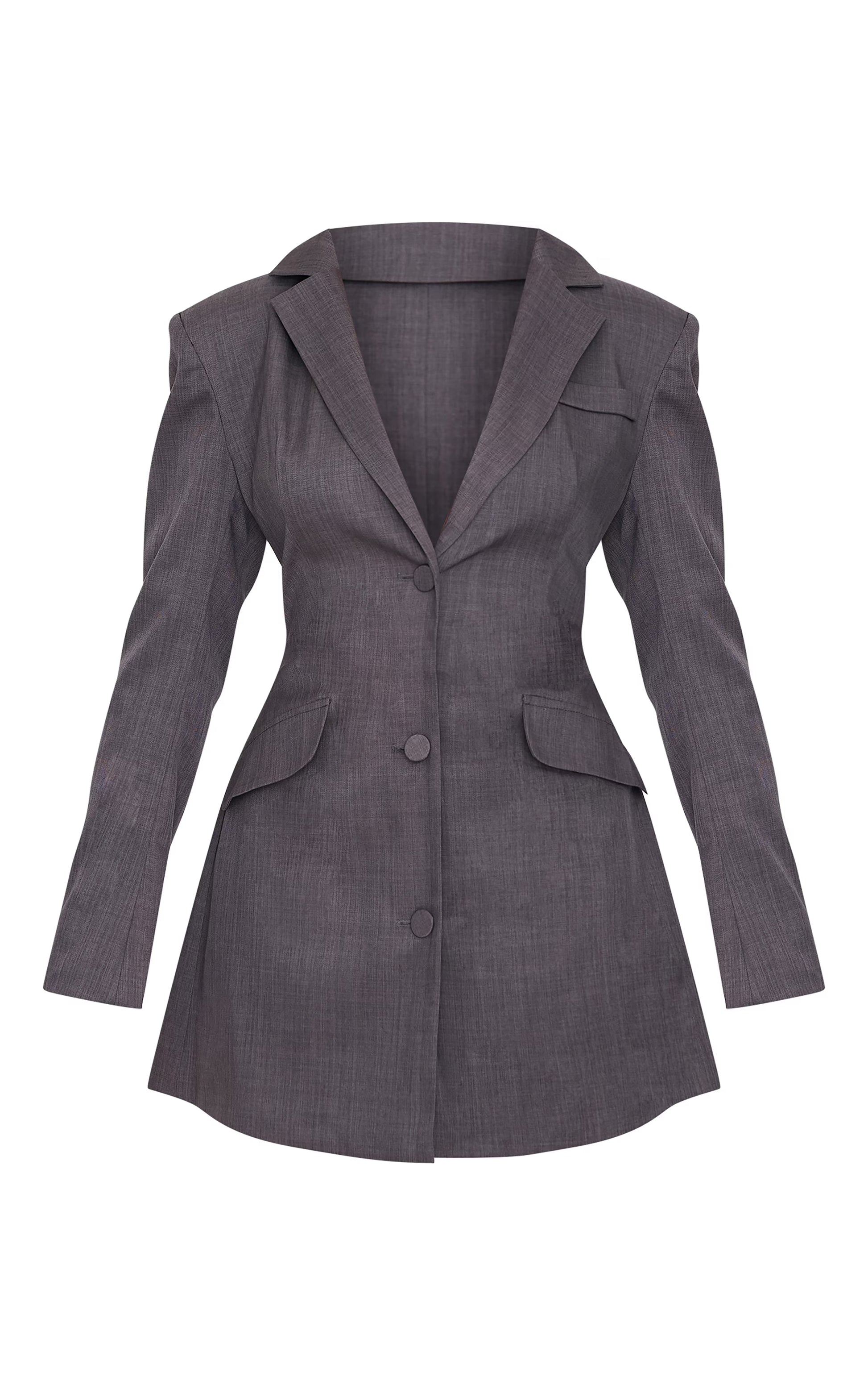 Refine your after-dark edit with this charcoal woven blazer dress. Crafted from a tactile woven fabric, this piece offers a structured silhouette with a cinched waist to define the figure. The sharp tailoring lends itself to a contemporary aesthetic, easily styled for evening engagements. Enhance the look with a delicate chain necklace from our jewelry collection for understated impact.