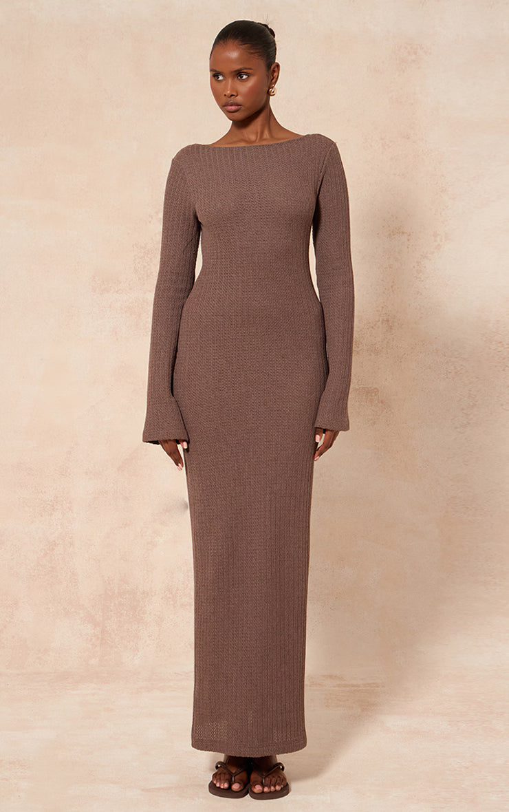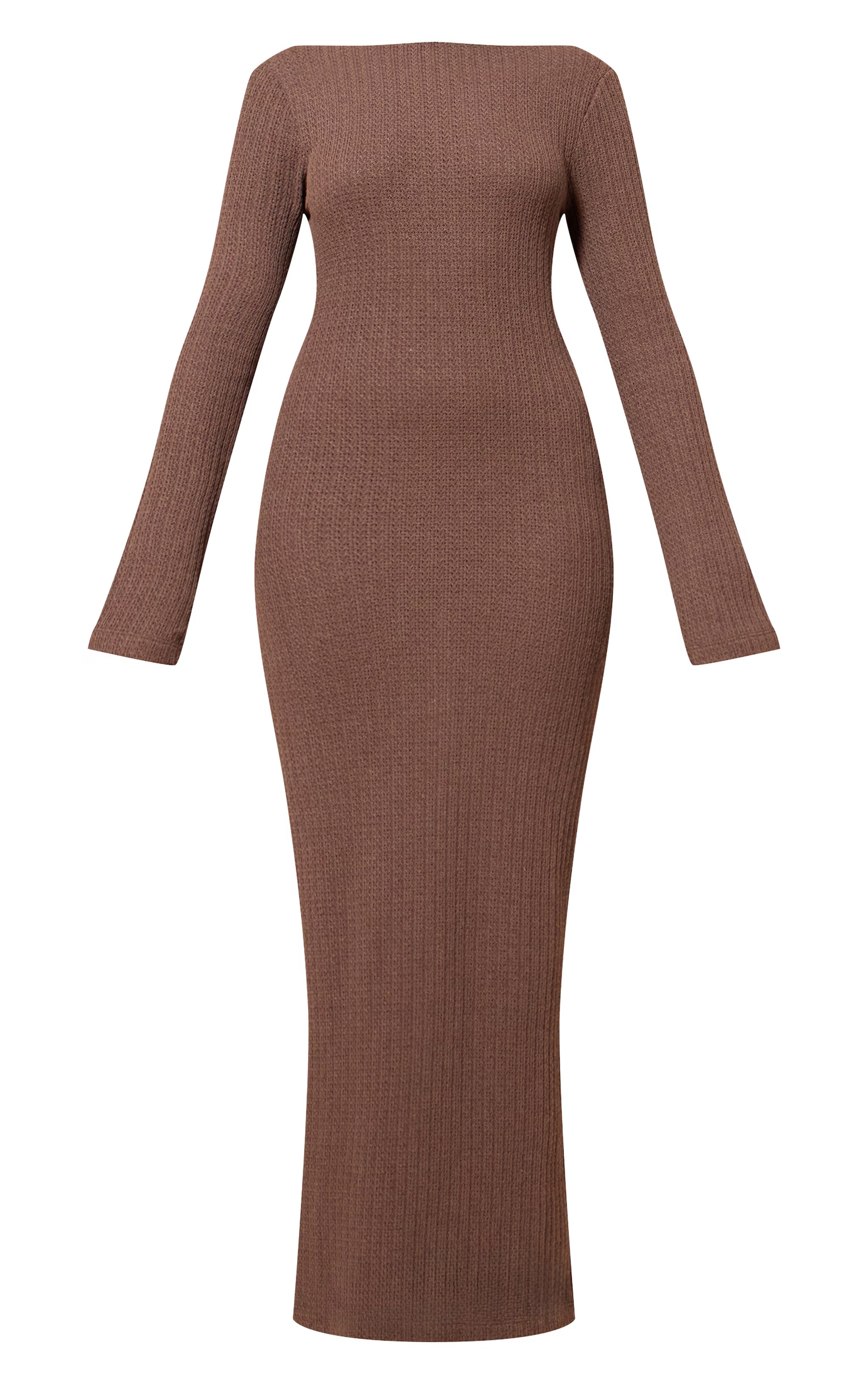 Taupe Textured Boat Neck Backless Long Sleeve Maxi Dress