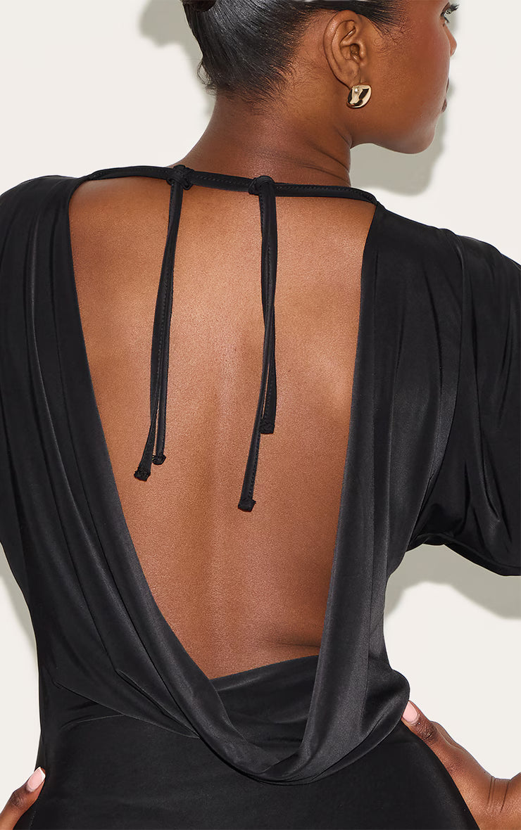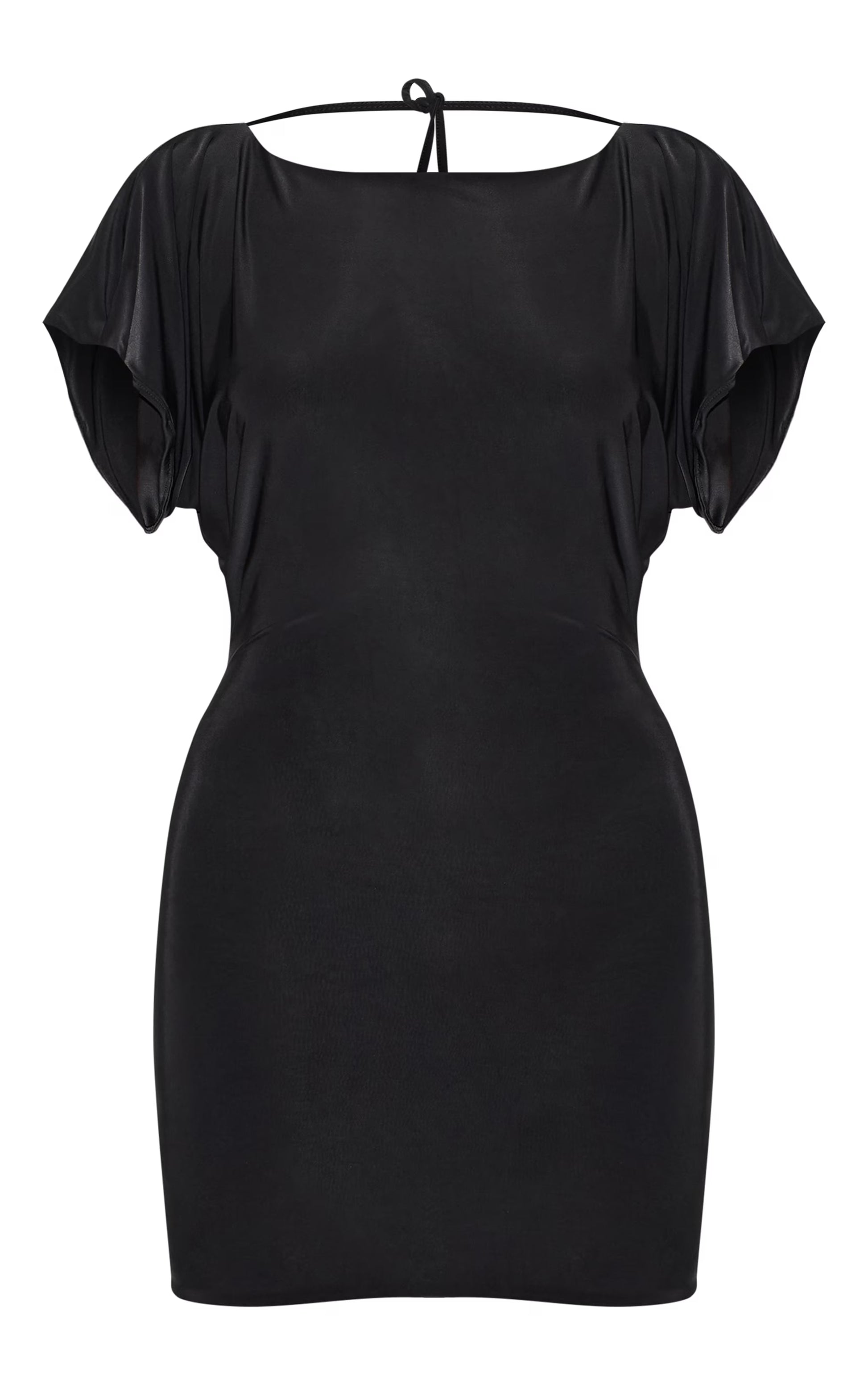 Keep it sleek this season in this black double layered slinky ruched short sleeve mini dress. Tailored from black material, this dress has capped sleeves with a low back design. For an outfit that will turn heads, style this dress with strappy stiletto heels and gold statement jewelry.