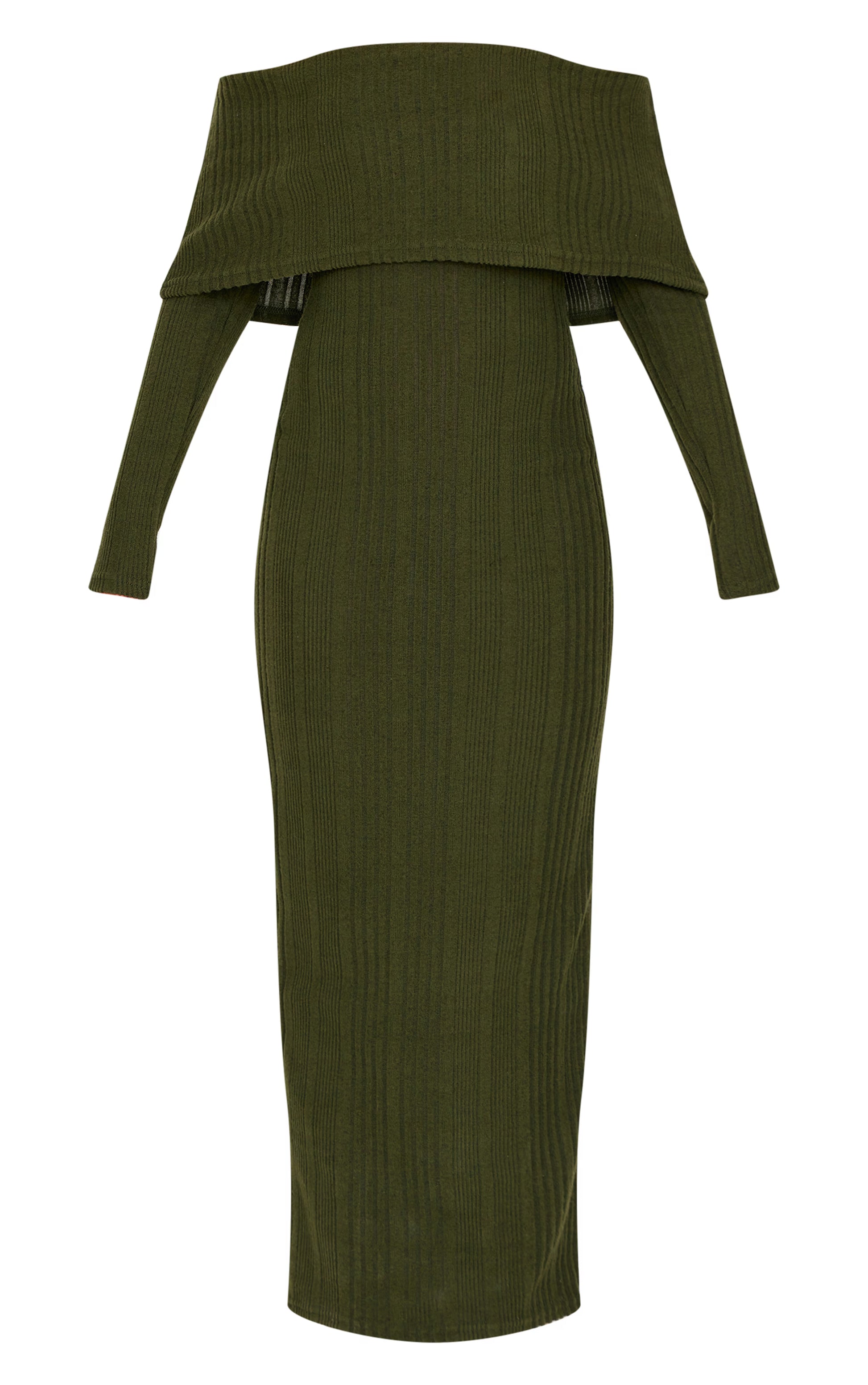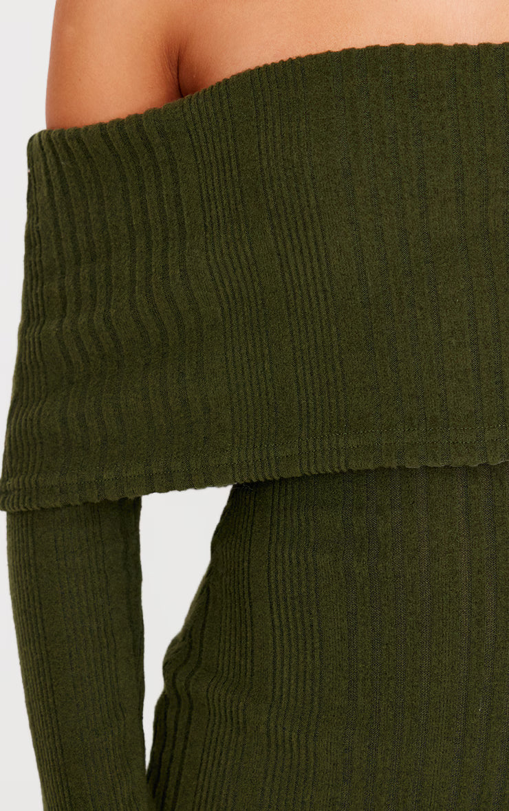 Green Brushed Rib Foldover Bardot Maxi Dress