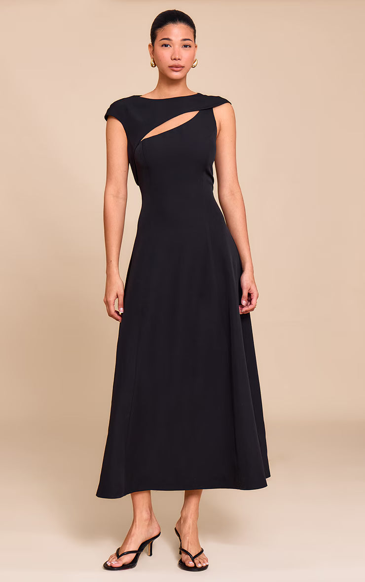 Define your occasion look in an elevated style. The Black Asymmetric Cut Out Detail Midaxi Dress exudes a confident look with its unique neckline, presenting a sharp cut out detail and striking asymmetric cut. This piece follows a clean line effortlessly to a midaxi length, holding its refined shape. Complement the look with minimalist heeled mules and subtle jewelry for an undeniably polished aesthetic.