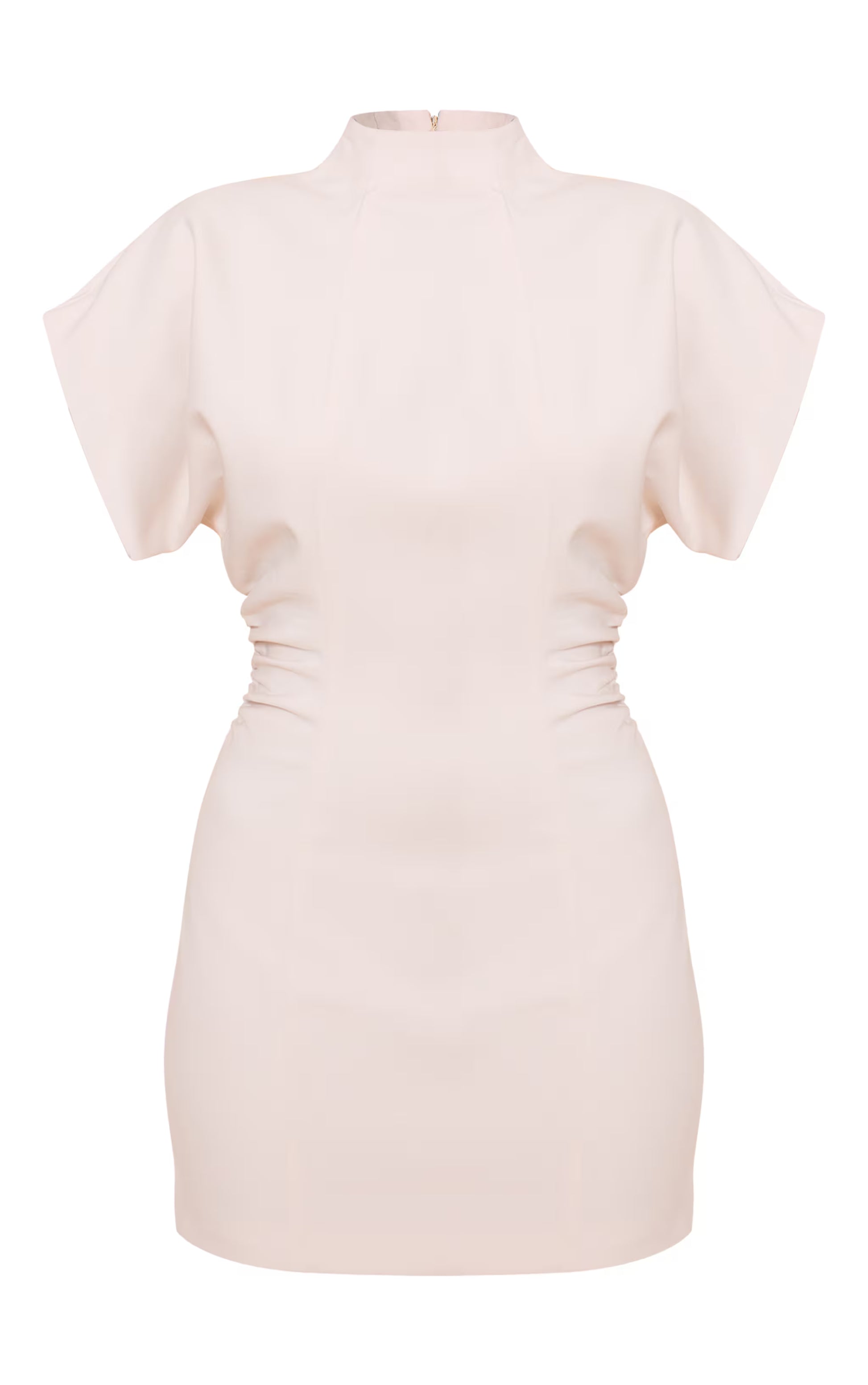 The cream cap sleeve ruched detail mini dress channels elegance with a modern twist. With its soft draping and ruched detailing, this mini dress flatters in all the right places. The cap sleeves add a touch of drama while keeping the look refined. Style with metallic heels and a soft clutch for elevated evening dressing.